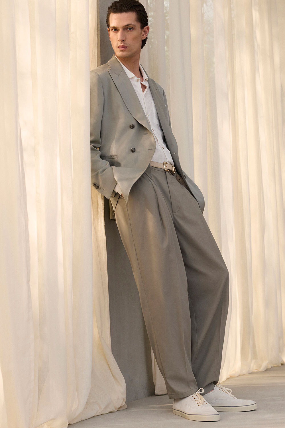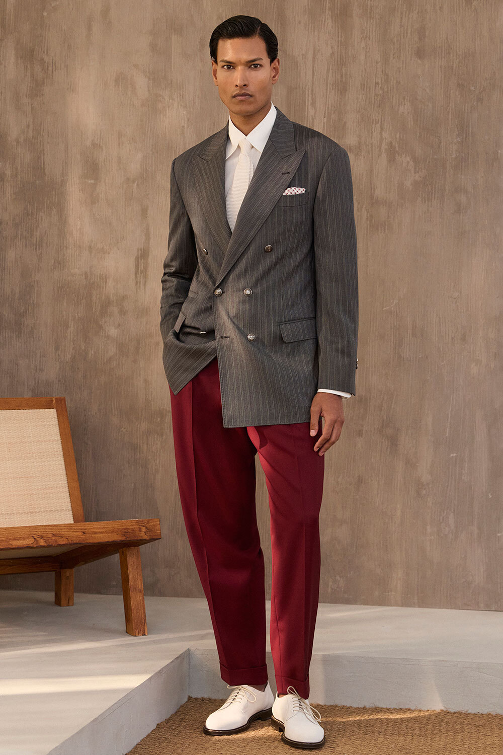 Коллекции Brunello Cucinelli сегодня включают огромное разнообразие моделей на все случаи жизни: от игры в теннис до катания на лыжах и яхтинга. Костюм здесь давно не занимает центральное место, однако по части актуального силуэта и посадки бренд остается одним из наиболее точных индикаторов в мужской моде. В новой коллекции – свободные в бедрах брюки, лишь слегка сужающиеся книзу, и полуприлегающие пиджаки с естественной драпировкой. В них ощущается влияние Джорджо Армани времен его расцвета и портновская школа Доменико Карачени. Учитывая, что ярко-красный уже появлялся в осенней коллекции бренда, можно предположить, что эта палитра с нами надолго.