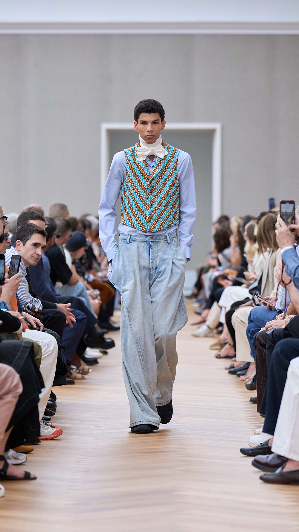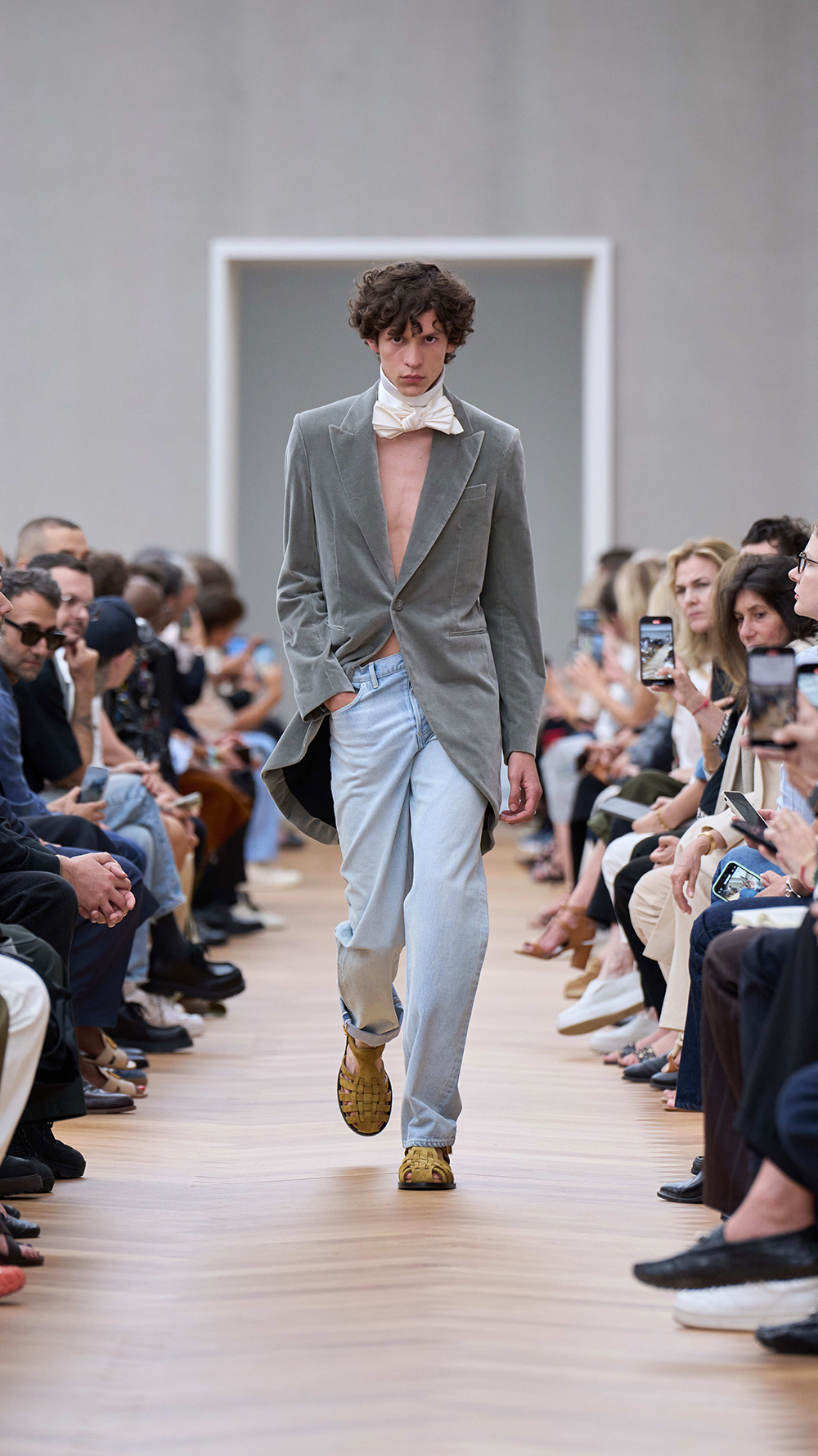 Распахнутые вышитые сюртуки с жилетами XVIII века и краваты с пышными бантами до подбородка напоминают о мюскаденах и анкрояблях – пижонах-роялистах эпохи Великой французской революции. Анкроябли культивировали образ жертв террора (некоторые даже имитировали нервный тремор от контузии), добиваясь «побитого жизнью» вида. Однако они под влиянием англомании тяготели к более сдержанным цветам и отделкам. Им посвятил свою выпускную коллекцию 1984 года Джон Гальяно, позднее возвращавшийся к их образам в женских коллекциях Dior. Стиль революции, который Бальзак описал как «дебаты между шелком и сукном» (роялистов и революционеров), – у Джонатана Андерсона становится спором между бархатом и денимом. Хотя с точки зрения современного стиля это давно уже не спор, а привычная комбинация.
