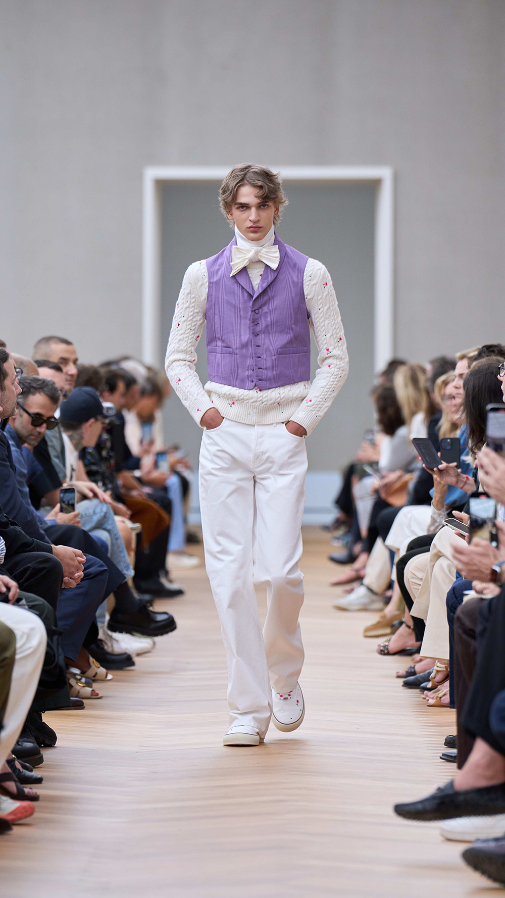 В муаровых и вышитых жилетах легко усмотреть одновременно отсылку к моде георгианской Англии XVIII века, в значительной степени вдохновленной пышным французским стилем, и ее отражению в «павлиньей революции» Лондона 1960–70-х, когда камзол впервые повстречался с джинсами в уличной моде.