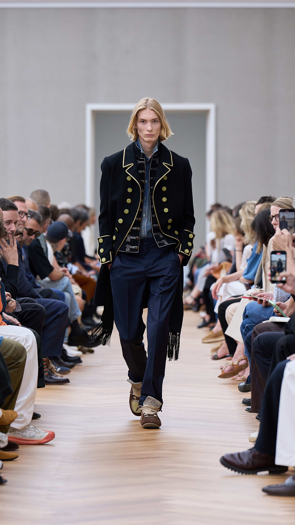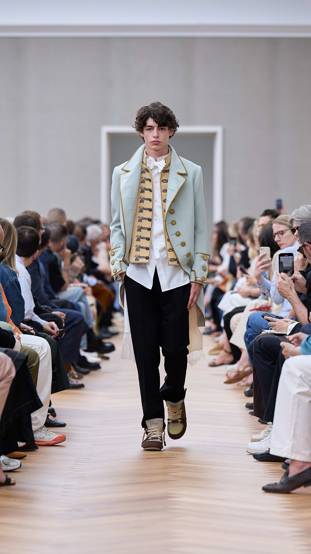 Коллекция оказалась настолько франко-британской, насколько таковым является и сам парижский дом, более полувека из своей 80-летней истории возглавляемый носителями британской культуры. Напомним, Андерсон родился и вырос в Северной Ирландии. В своей первой коллекции он обратился к началу радикальных изменений в мужской моде, случившихся на рубеже XVIII–XIX веков и приведших в итоге в возникновению классического костюма. Эту трансформацию во многом предопределили исторические события и вечное соперничество, наряду с культурным взаимовлиянием, Франции и Британии.