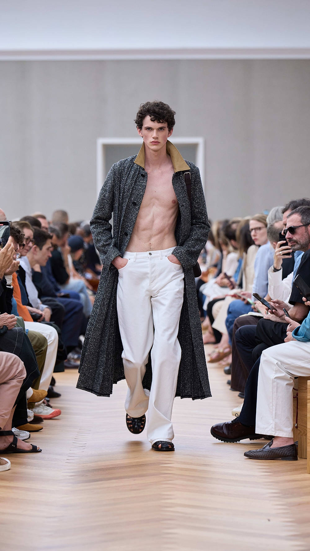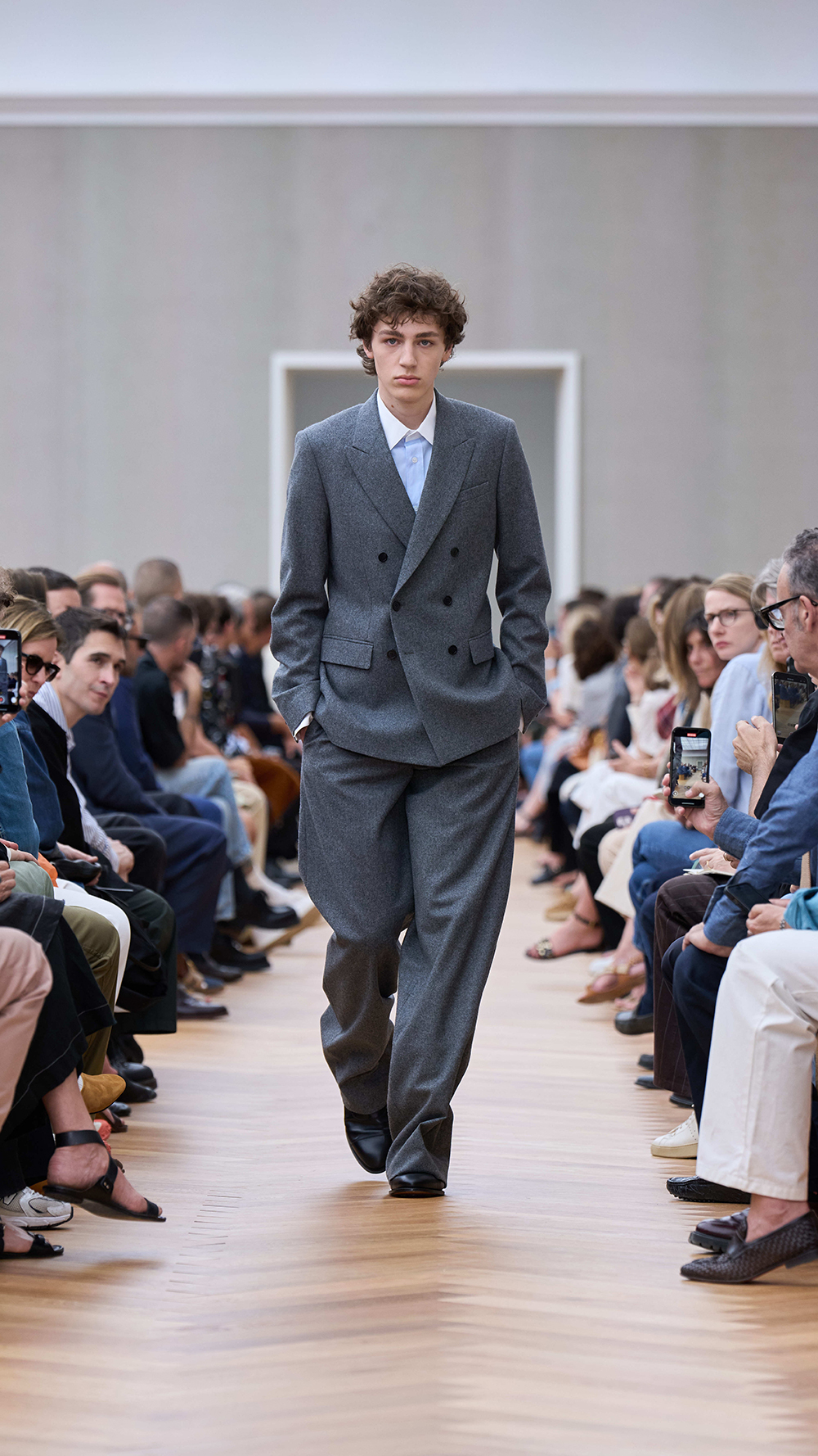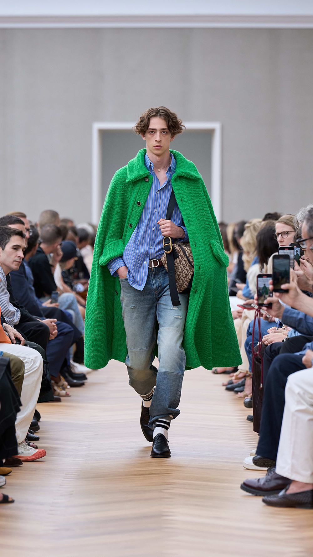 Джонатан Андерсон сделал показ камерным – настолько, насколько это вообще возможно для мегабренда вроде Dior. Перед Дворцом инвалидов был выстроен серый куб, внутри которого воспроизвели залы берлинской Gemäldegalerie с обитыми бархатом стенами и двумя единственными экспонатами. Миниатюрные натюрморты Жана-Батиста Симеона Шардена – с горкой земляники (недавно приобретена Лувром за 24 млн евро) и цветами в вазе (из Эдинбургского музея), как и само приглашение на показ в виде керамической тарелки с тремя яйцами – также с картины Шардена, – стали ключом к пониманию этой коллекции и новой тональности Dior. «Великий реалист XVIII века» Шарден прославился «тихими» бытовыми портретами и натюрмортами и умением показать красоту самых будничных вещей. Его работы задали иной, почти интимный, тон событию и стали хронологической точкой отсчета для образов, которые развернул дизайнер в этой коллекции. Она выглядела настолько продуманной и сложносоставной, что очевидно: работа над ней началась задолго до официального вступления Андерсона в должность в апреле этого года.