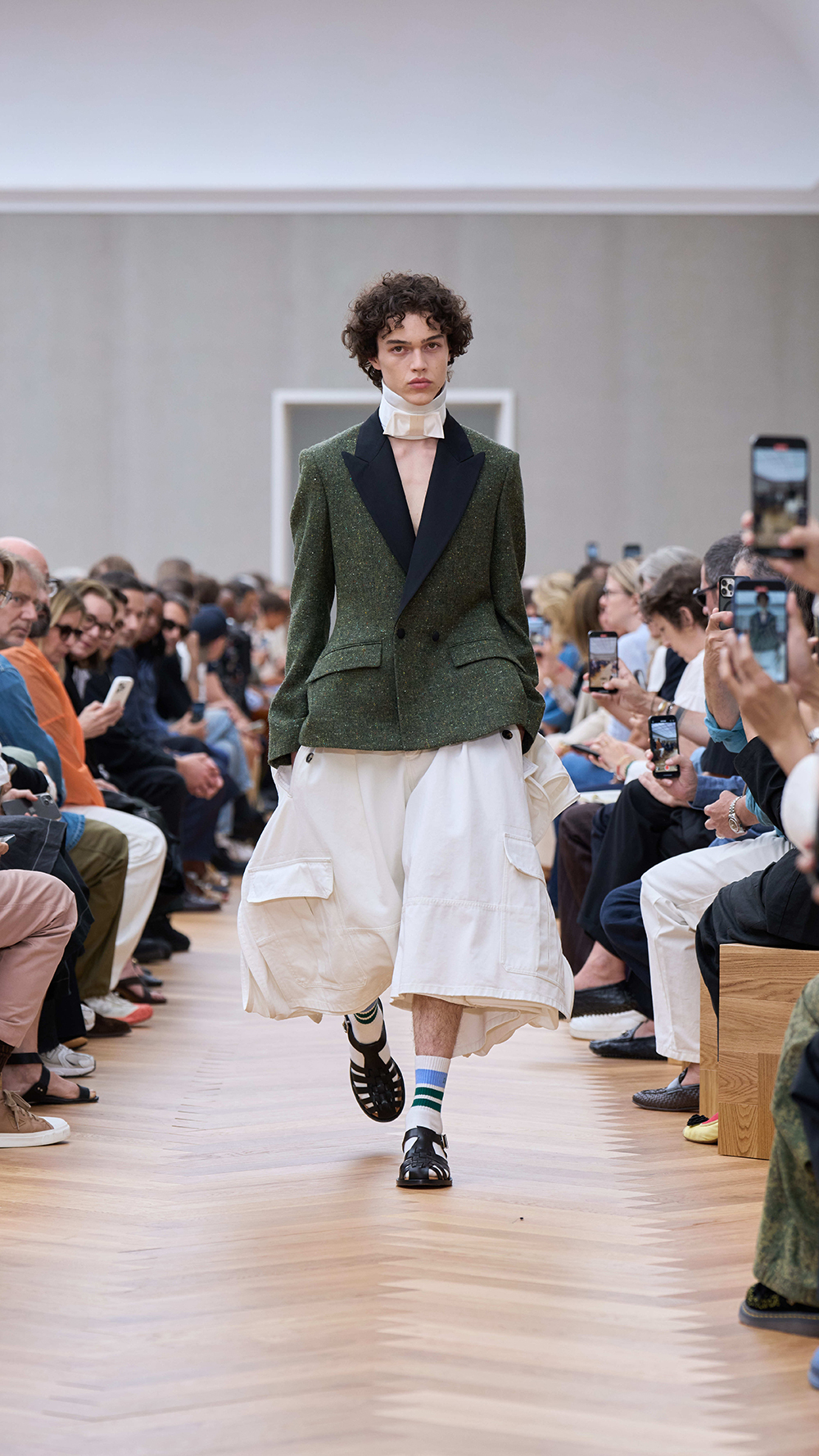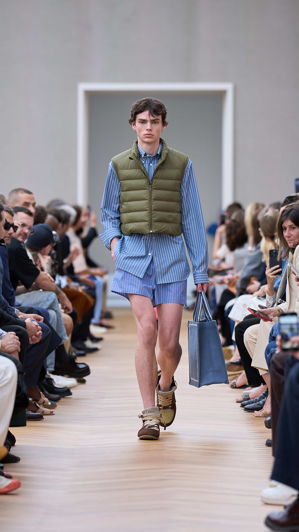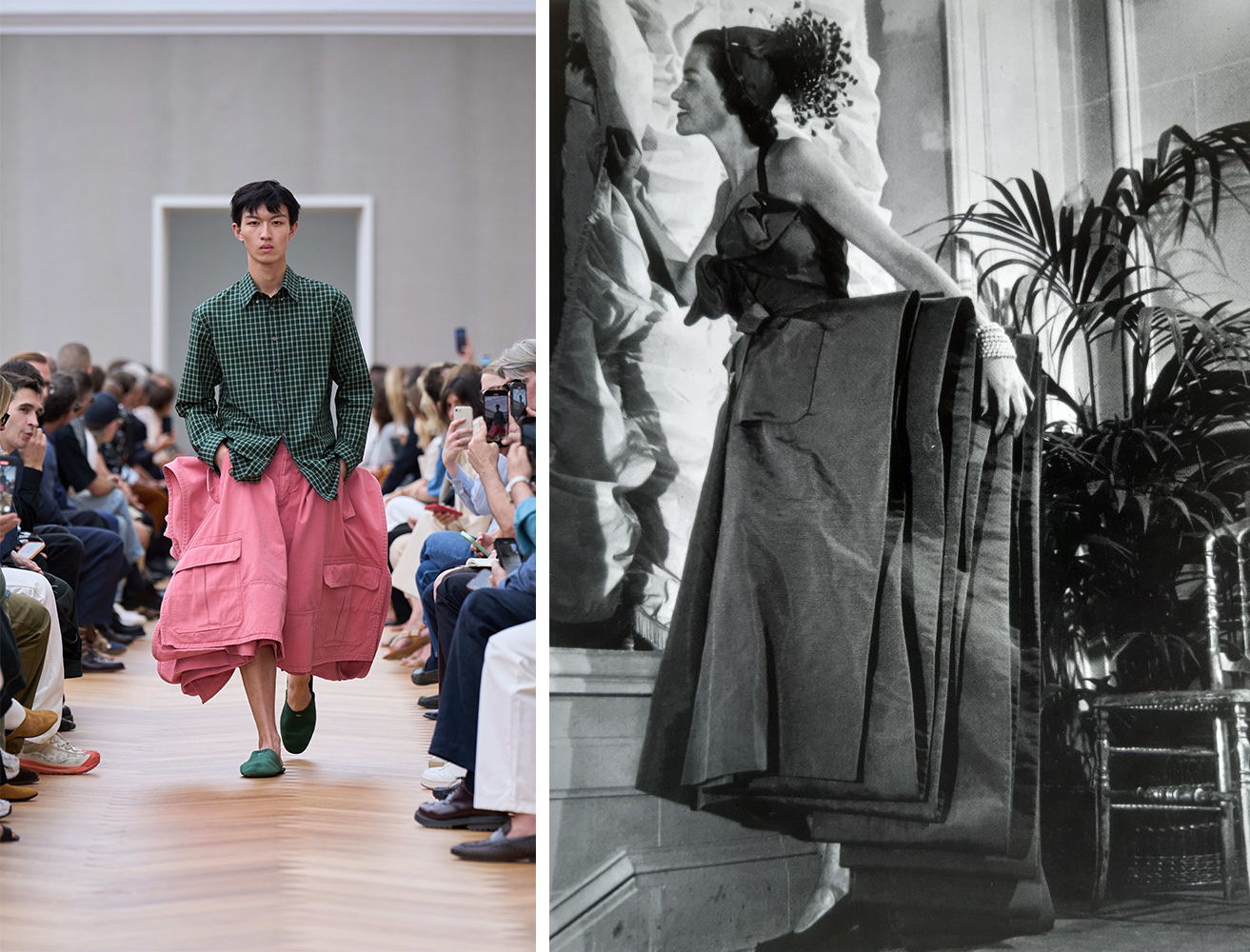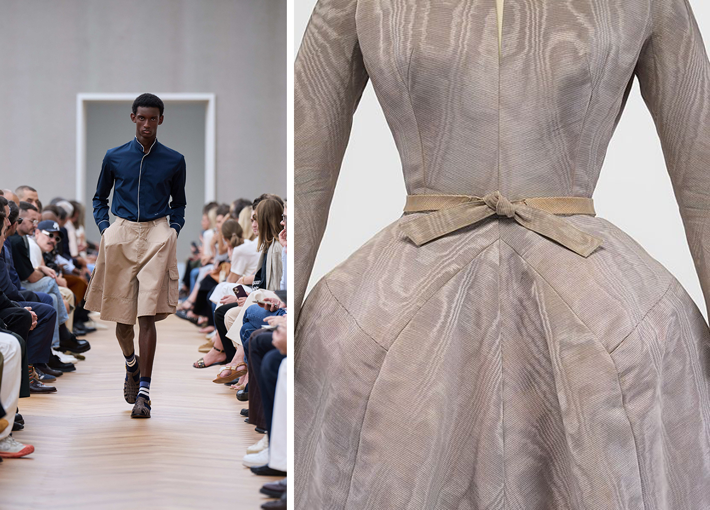 Разумеется, «коды» Dior присутствуют в коллекции – и не самые очевидные. Так, знаменитый жакет Bar появляется в нескольких вариациях, включая версию из ирландского твида Донегол с атласными лацканами. Многослойные шорты-карго отсылают одновременно к платью Cyclone времен Кристиана Диора (1948–1949) и к объемным юбкам кухарок на портретах Шардена. Еще одни шорты повторяют линии кроя платья La Cigale (1952) с клиньями.