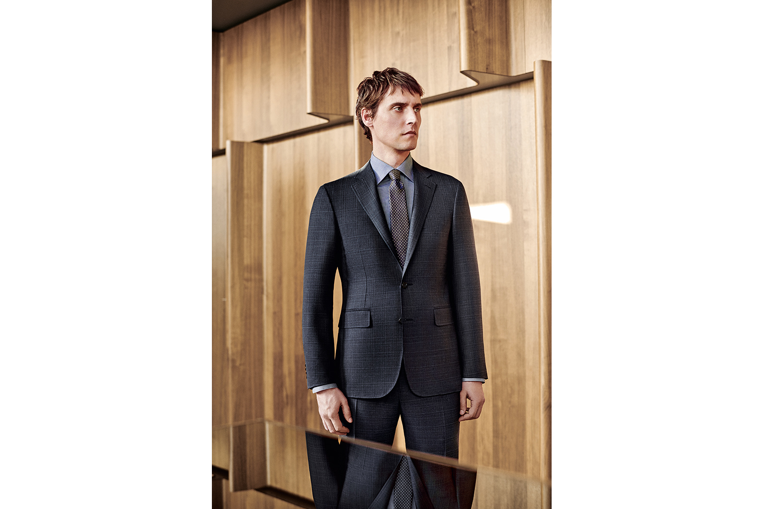 Еще одна выдающаяся модель Kiton – Lasa – это пиджак, который виртуозно повторяет форму тела и при этом удобен и легок, как пижама. У костюма неаполитанские плечи без подкладок и характерные складки на рукаве – еще одна особенность неаполитанского стиля.