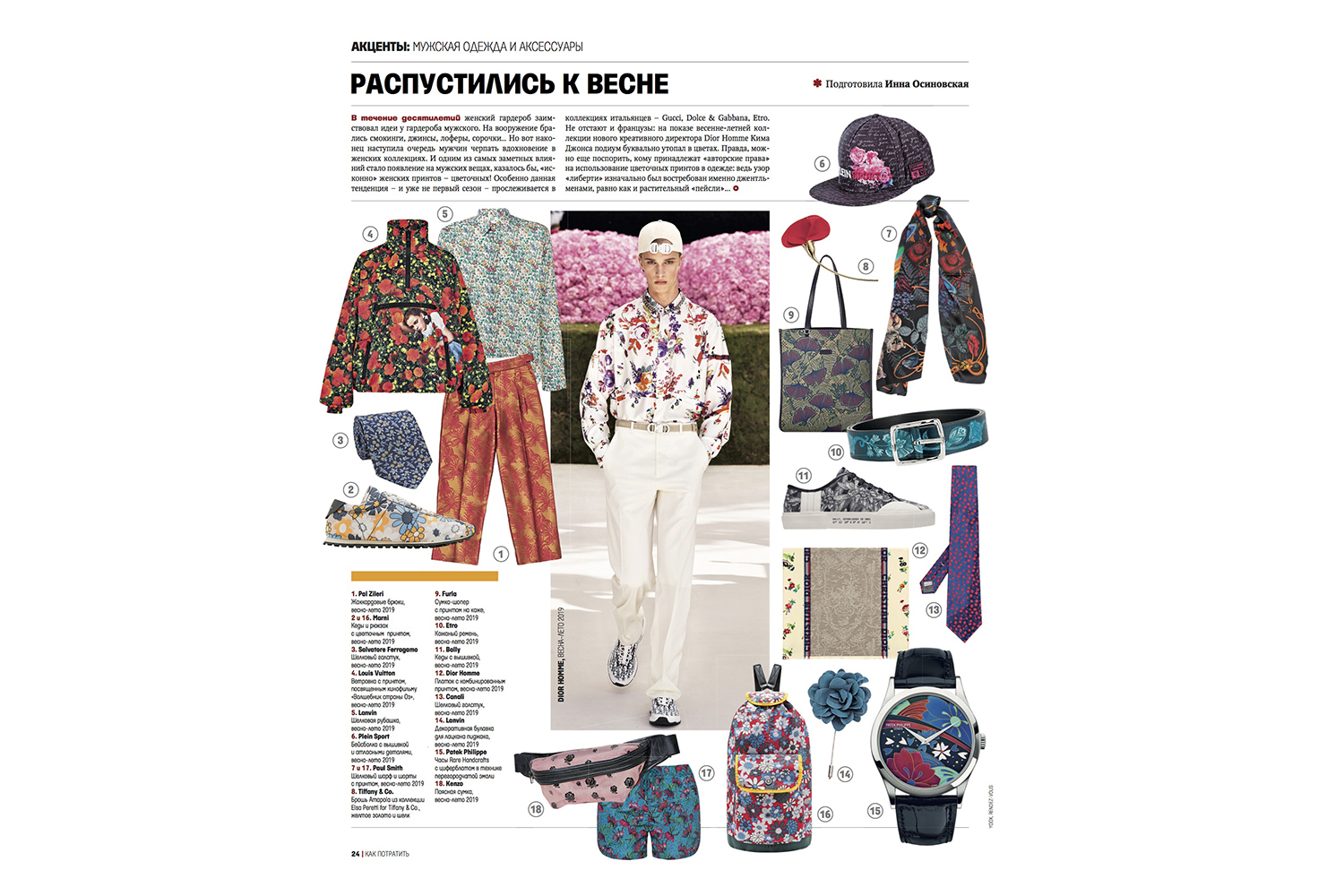 В течение десятилетий женский гардероб заимствовал идеи у мужского. На вооружение брались смокинги, джинсы, лоферы, сорочки… Но вот наконец наступила очередь мужчин черпать вдохновение в женских коллекциях. И одним из самых заметных влияний стало появление на мужских вещах, казалось бы, «исконно» женских принтов – цветочных! Особенно данная тенденция – и уже не первый сезон – прослеживается в коллекциях итальянцев – Gucci, Dolce & Gabbana, Etro. Не отстают и французы: на показе весенне-летней коллекции нового креативного директора Dior Homme Кима Джонса подиум буквально утопал в цветах. Правда, можно еще поспорить, кому принадлежат «авторские права» на использование цветочных принтов в одежде: ведь узор «либерти» изначально был востребован именно джентльменами, равно как и растительный «пейсли»