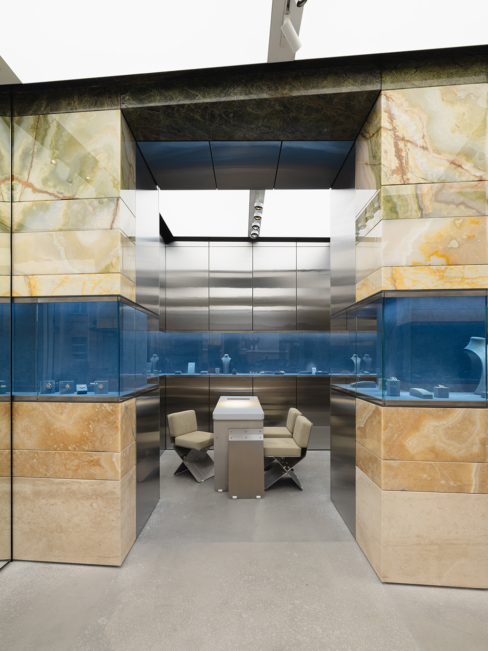 За обновленный интерьер бутика Alrosa на Петровке отвечало архитектурное бюро Kozeen + Rueda. Идея проекта – погрузить гостей бутика в мир добычи алмазов, передать его атмосферу, создать ощущение, будто они оказались внутри кимберлитовой трубки. Вдохновением послужила выставка «Путь бриллианта. Чудо природы и рукотворный шедевр», которая проходила в ГИМе в 2023 году. В отделке использованы семь слоев разных сортов мрамора – этот микс отсылает к особому виду среза земли, в котором идет добыча алмазов. Также в оформлении пространства и в мебели использована сталь, символизирующая спецтехнику для поиска и обработки камней. Отдельная строка дизайна – световые сценарии, которые меняются в зависимости от времени суток.