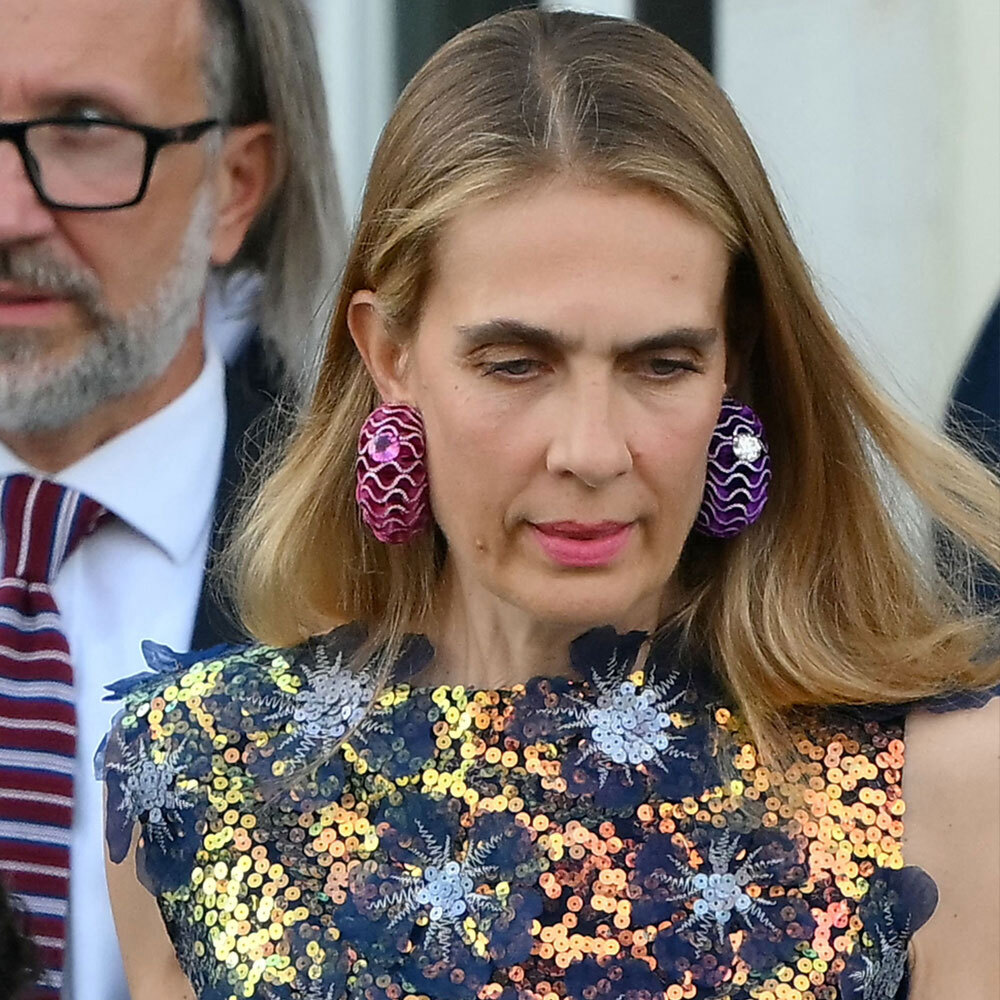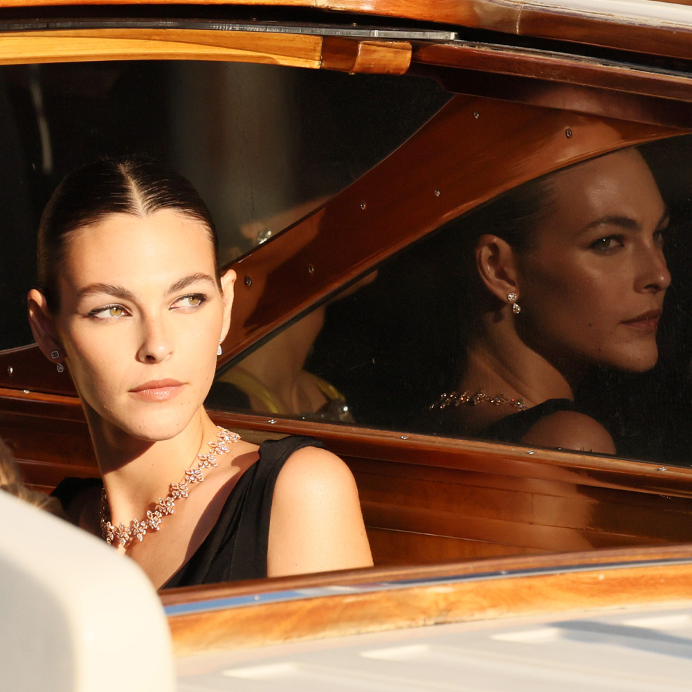 Лорен Санчес шлет воздушный поцелуй толпе на выходе из отеля Aman Venice (для своей свадьбы пара полностью забронировала пять отелей) в надетом на правую руку помолвочном кольце Lorraine Schwartz с розовым бриллиантом, которое Джефф Безос подарил ей на борту своей яхты Koru в мае 2023-го