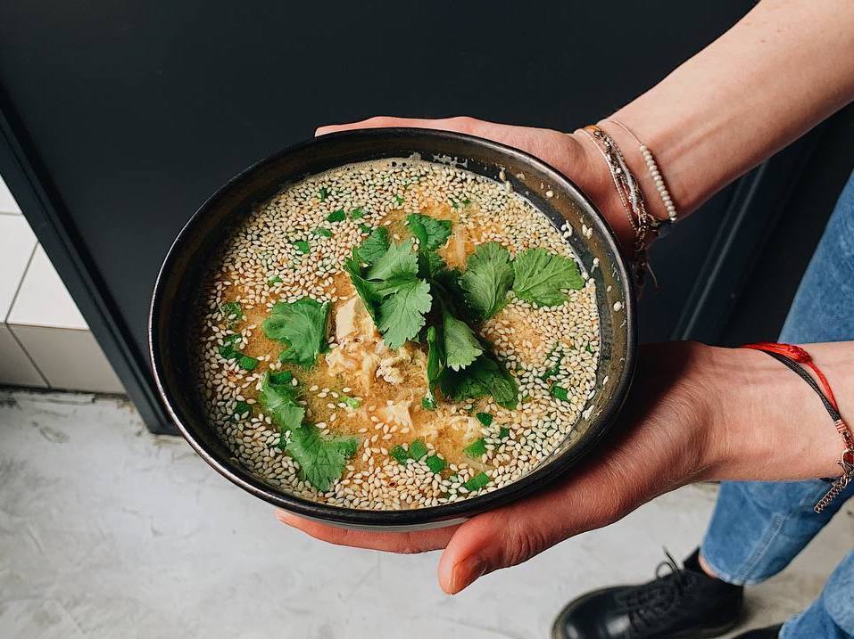 Выложить получившийся суп в глубокую тарелку. Перед подачей украсить блюдо кунжутом, кинзой и мелкорубленым зеленым луком.
