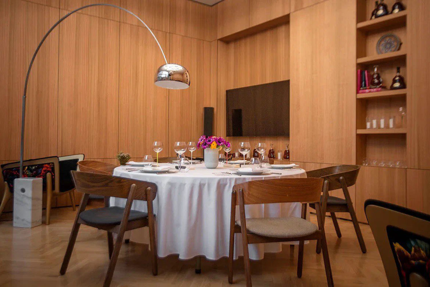 Продуманная расстановка столов на двух уровнях стеклянного пентхауса создает иллюзию камерности, да и закрытое пространство шеф-стола предлагает необходимую уединенность – это ресторан для очень важных встреч.