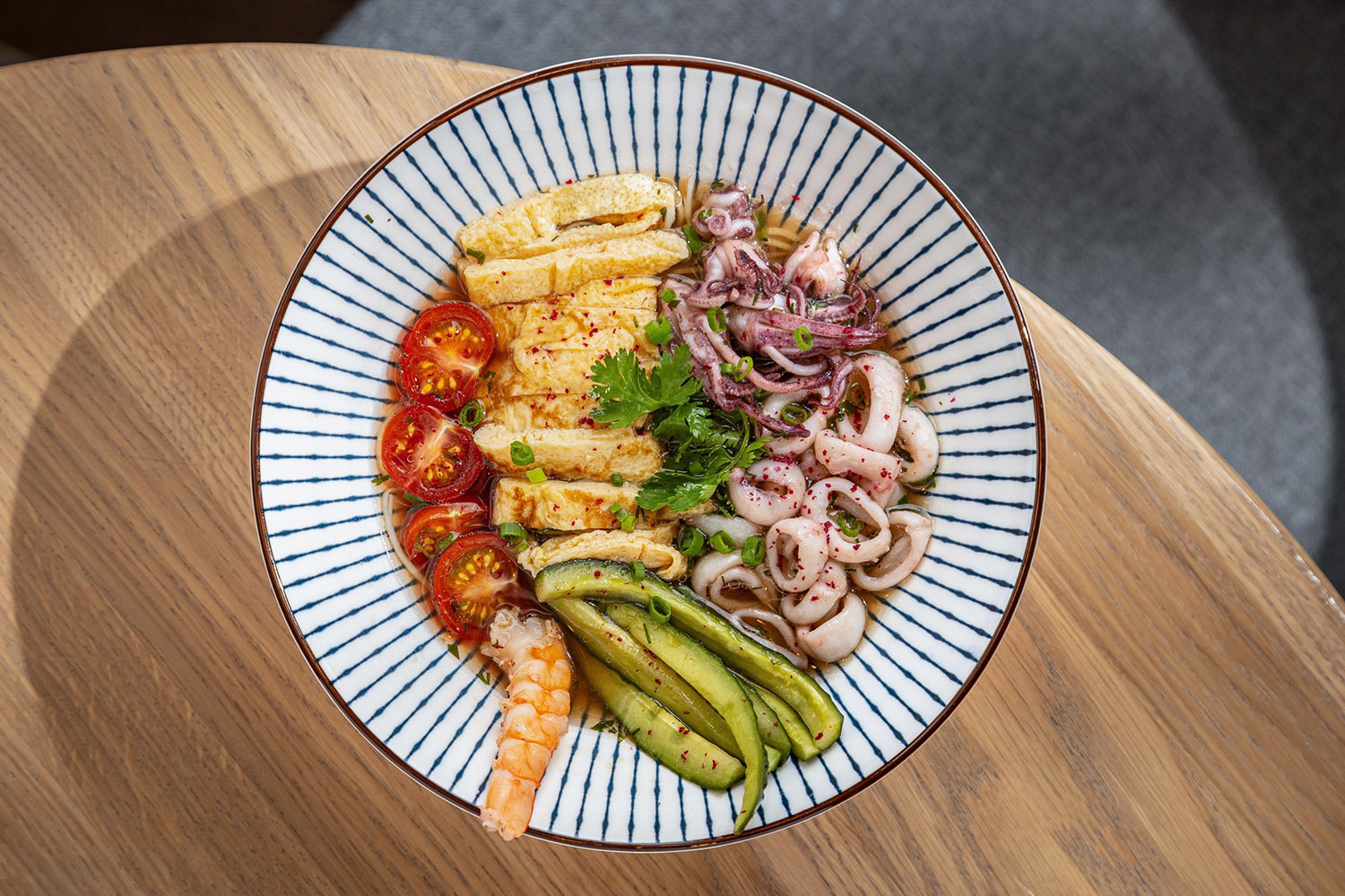 В тарелку выложить яичную лапшу, омлет томаго, черри-томаты, огурцы кимчи, креветку и кальмары. Залить бульоном, украсить сумахом и листиками кинзы.