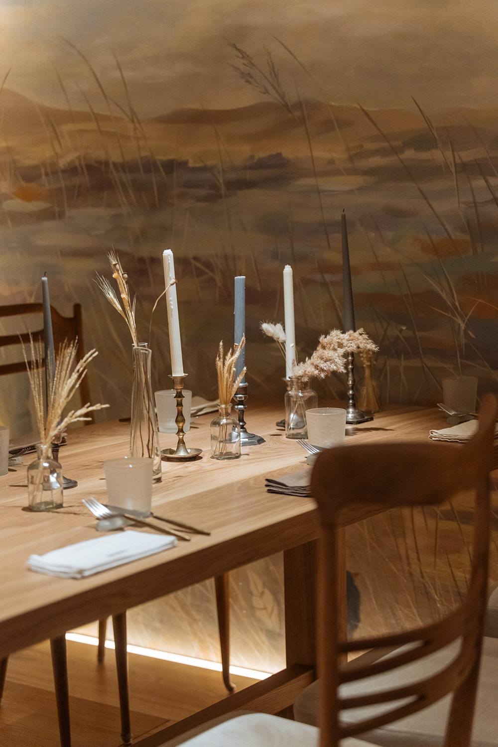За антураж отвечают матовое фактурное стекло из стеклодувной мастерской при Художественно-промышленной академии Штиглица, крафтовая керамика и необычный фарфор, потолок с «Ботаническими манускриптами» Александра Герасимова, отдельный кабинет, похожий то ли на изящную шкатулку, то ли на магическую пещеру, и открытая кухня – главное место священнодействия.