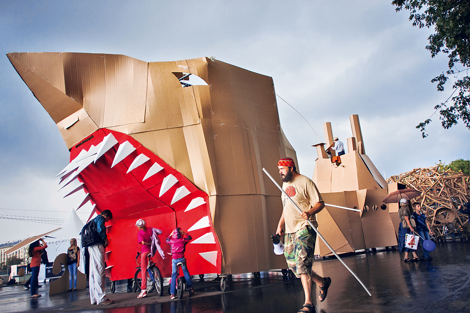Одним из самых многолюдных мероприятий стал фестиваль в Перми в 2012 году. «Тогда мы материализовали город Картон-на-Каме, который посетило около 400 000 туристов за три недели существования», – рассказывает Сергей. С тех пор картонный город с настоящими картонными домами, магазинами, транспортом, театрами, музеями, банками, обязательным складом картона и всем прочим, необходимым для жизни и развития городской инфраструктуры, появляется каждый раз в новом месте и функционирует от 10 дней до месяца.