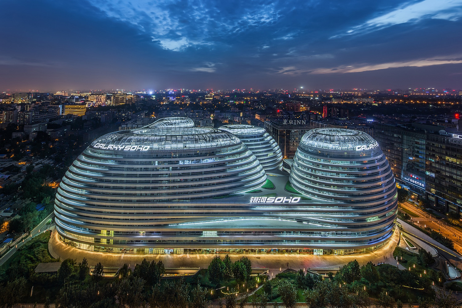 Торгово-офисный центр Galaxy Soho, построенный в 2012 году в Пекине, – первый китайский проект Zaha Hadid Architects и один главных архитектурных манифестов бюро. Здание сочетает все родовые черты, присущие архитектуре Хадид: динамизм, плавные линии, отсутствие углов, футуристический облик и резкий контраст с окружающей застройкой. Комплекс Galaxy Soho площадью 330 000 кв. м – это четыре овальных объема, соединенных стеклянными переходами. Купола здания в центре образуют атриум с балконами и галереями и несколько замкнутых внутренних дворов. Четыре нижних этажа занимает торгово-развлекательный центр, верхние двенадцать – офисы.