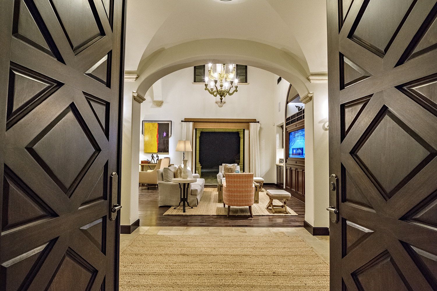 На дизайн особняка явно повлияли итальянские корни Сталлоне (его отец был иммигрантом и родился в Сицилии) – дом выстроен по большей части в классическом средиземном стиле, а перед входом в дом типичное итальянское патио. Однако налицо вкрапления и карибского стиля – к примеру, массивные входные двери из дерева. Для отделки используются также натуральные материалы.