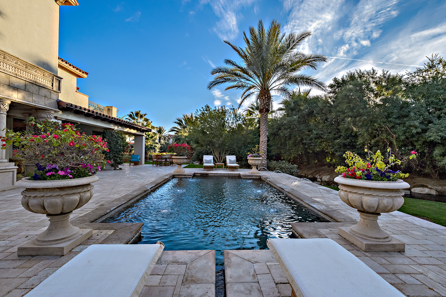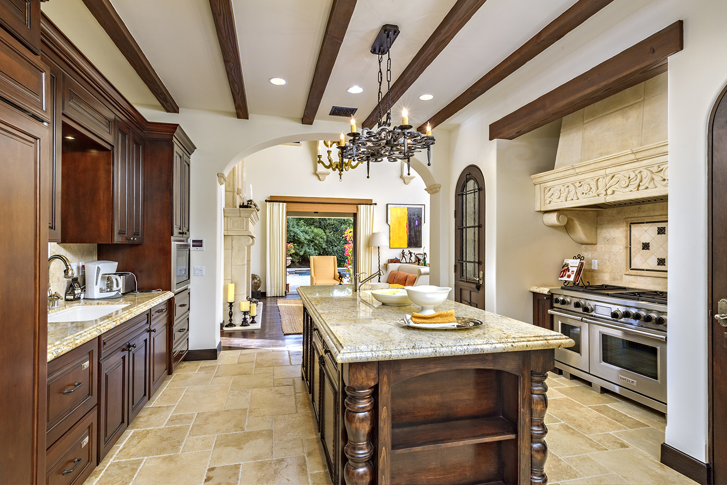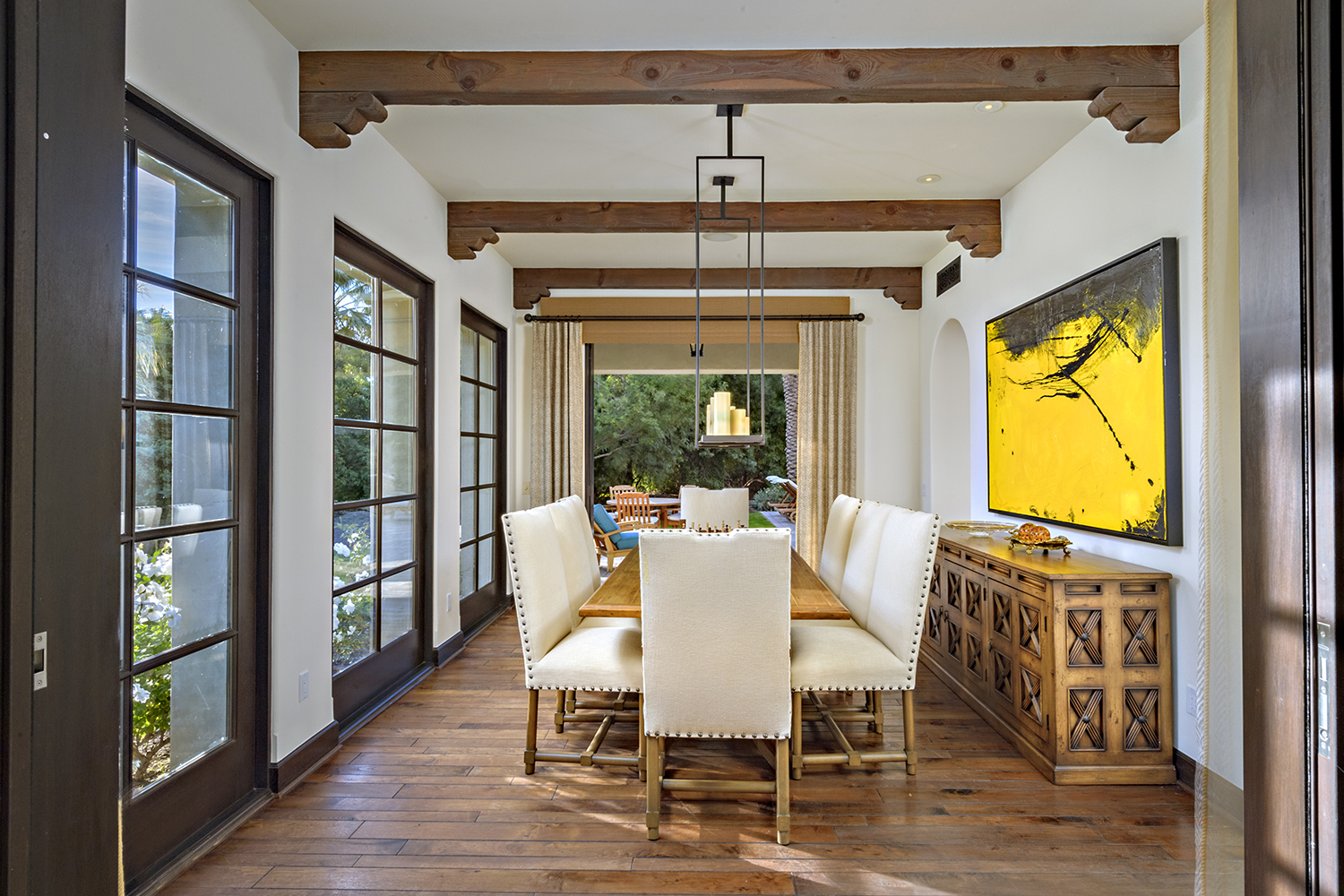 В доме есть столовая для официальных приемов и мероприятий. Из нее легко попасть на террасу на заднем дворе, где в условиях теплой солнечной Калифорнии можно принимать гостей практически круглый год. Есть и еще один приятный бонус: во внутренний дворик выходят двери многих комнат в доме, что создает ощущение свободы и простора.