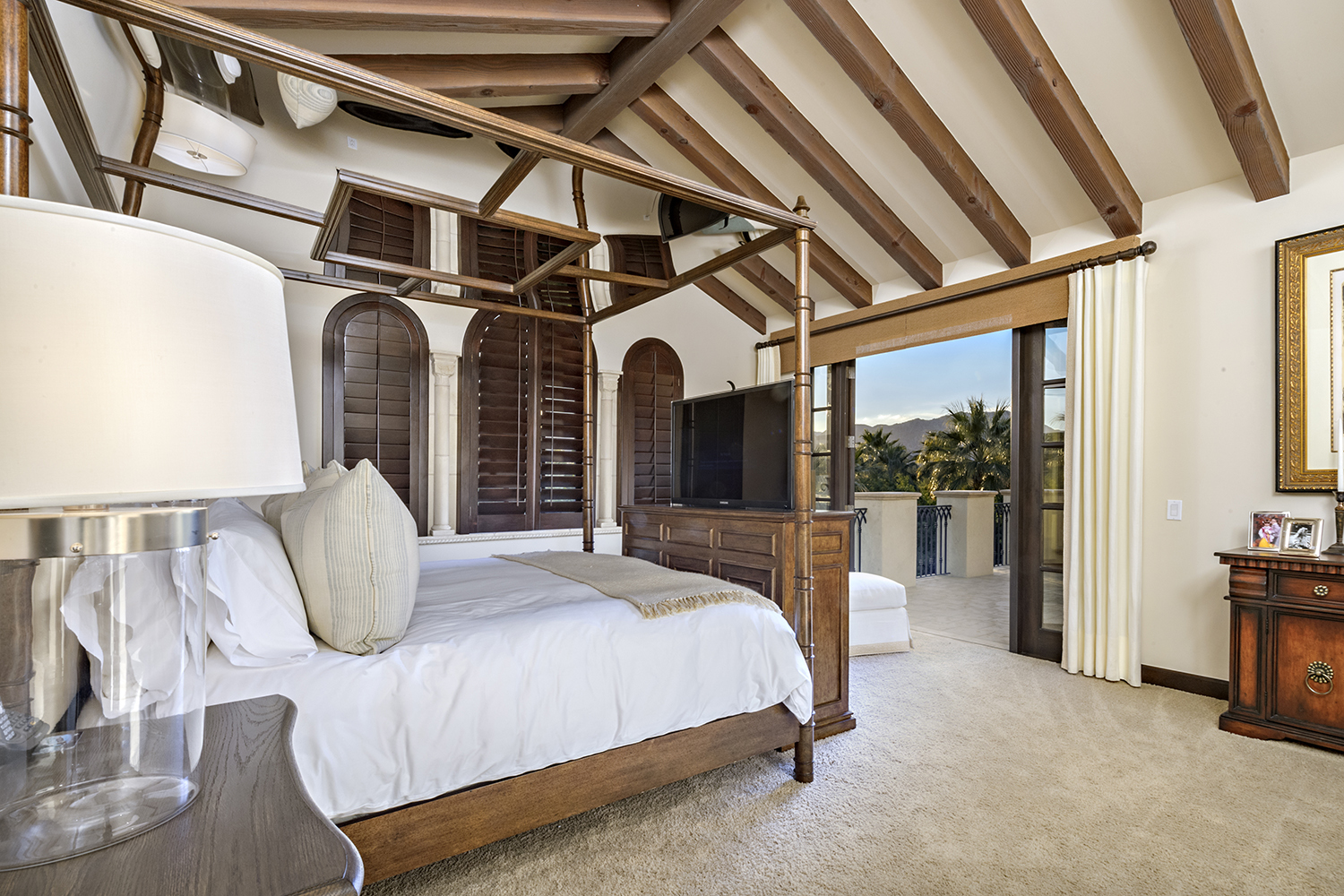 На верхнем этаже располагается главная из четырех спален в доме – спальня хозяев. Это настоящее отдельное семейное королевство с внушительной ванной комнатой, собственной гардеробной, а также персональной террасой, с которой открывается незабываемый вид на долину.