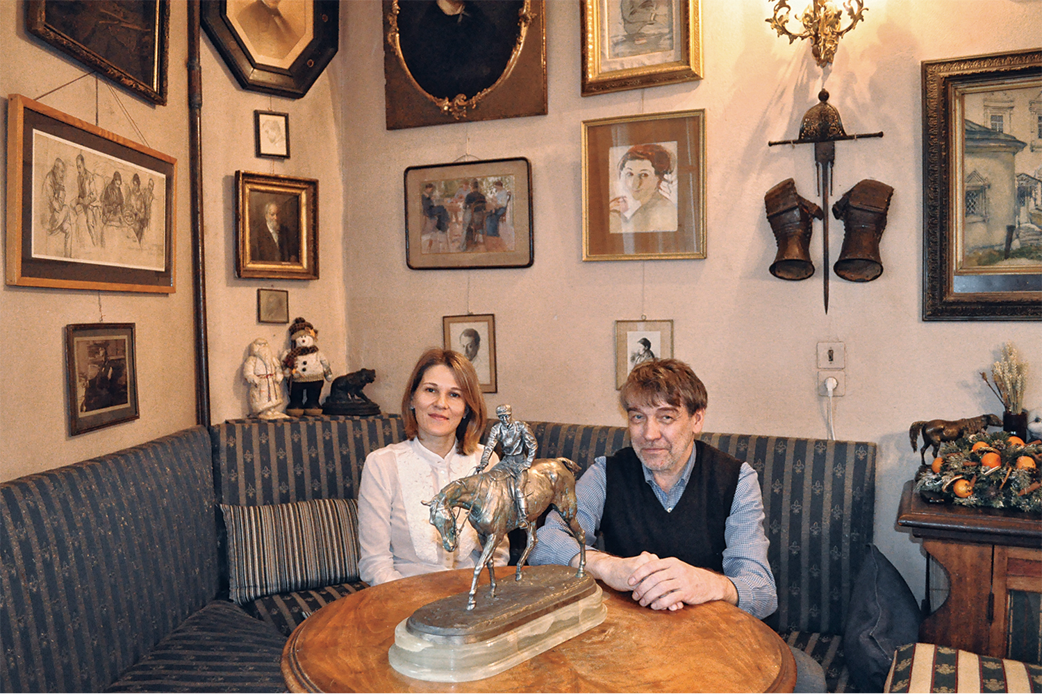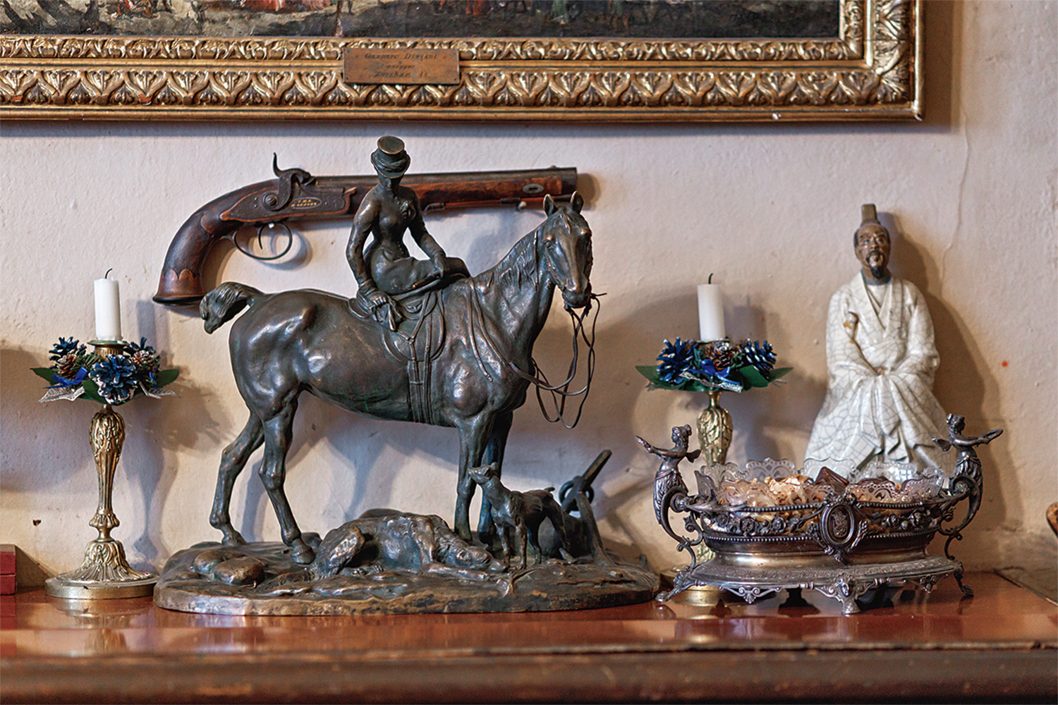 «Интерьер украшают скульптуры моего прадеда, картины Серебряковой, Александра Бенуа, моего деда… Есть, конечно, и мои работы – люстра, мелкая пластика из бронзы, подсвечники», – поясняет Евгений.