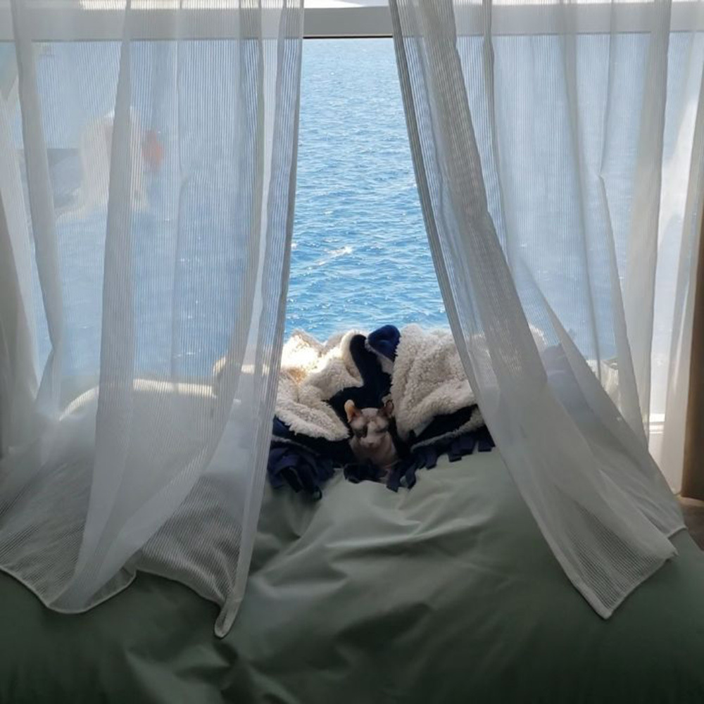 Мечтает о том, что когда-нибудь каждый пассажир круизного лайнера сможет взять с собой на борт питомца, и капитан мегалайнера Celebrity Edge Кейт Маккью. Неизменный спутник Кейт во всех поездках – кошка породы сфинкс по кличке Жук, у которой, кстати, тоже есть своя личная страница в инстаграме @bugnaked. «Она мой мир, благодаря ей я чувствую себя как дома», – отмечает капитан.