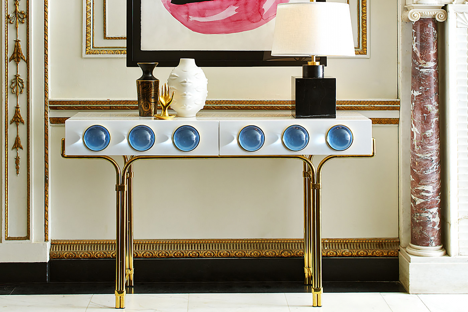 Приведу пример. Пару месяцев назад как раз закончился ремонт в моей новой квартире. И когда уже шла чистовая отделка, я неожиданно наткнулся на консоль Globo Джонатана Адлера: белую, прямоугольную, на высоких ножках, со стеклянными светло-голубыми шарами. Чудесная вещь, настоящее произведение искусства!