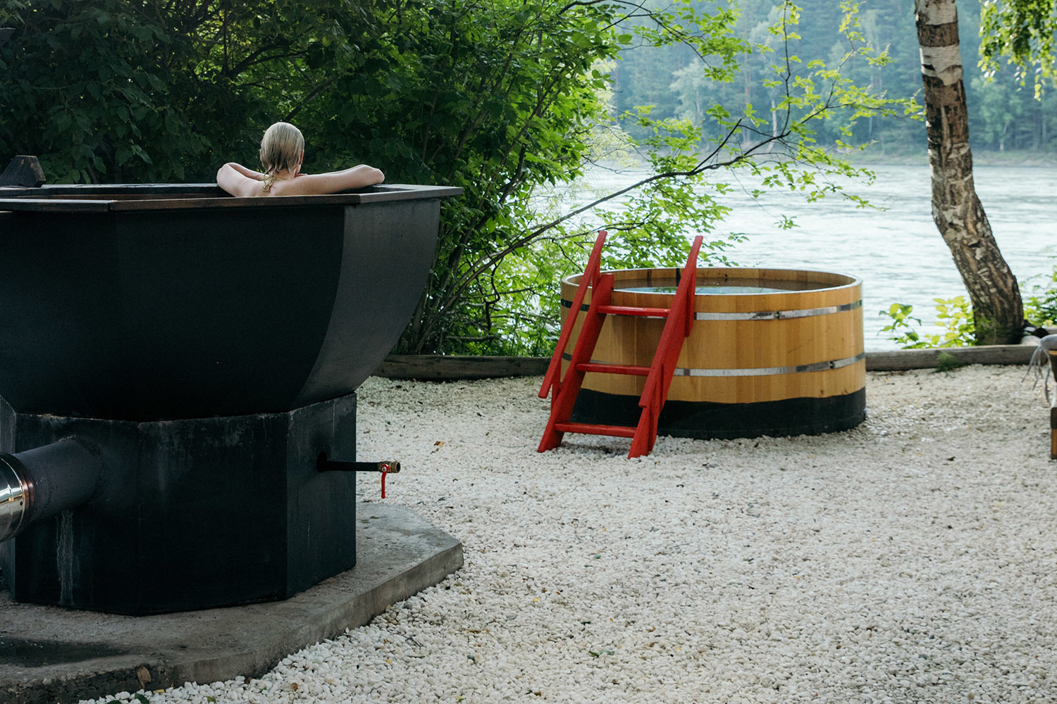 Даже в бане с панорамным окном, откуда открывается вид на Катунь, Ольга предусмотрела гениальную конструкцию. Точно так было в бане у ее бабушки в деревне: стол «для пара» на колесиках, который аккуратно проходит в дверной проем, – идея в том, чтобы человек, которого парят, не вставал со стола с целью охладиться на улице, его выкатывают головой на улицу прямо вместе со столом.