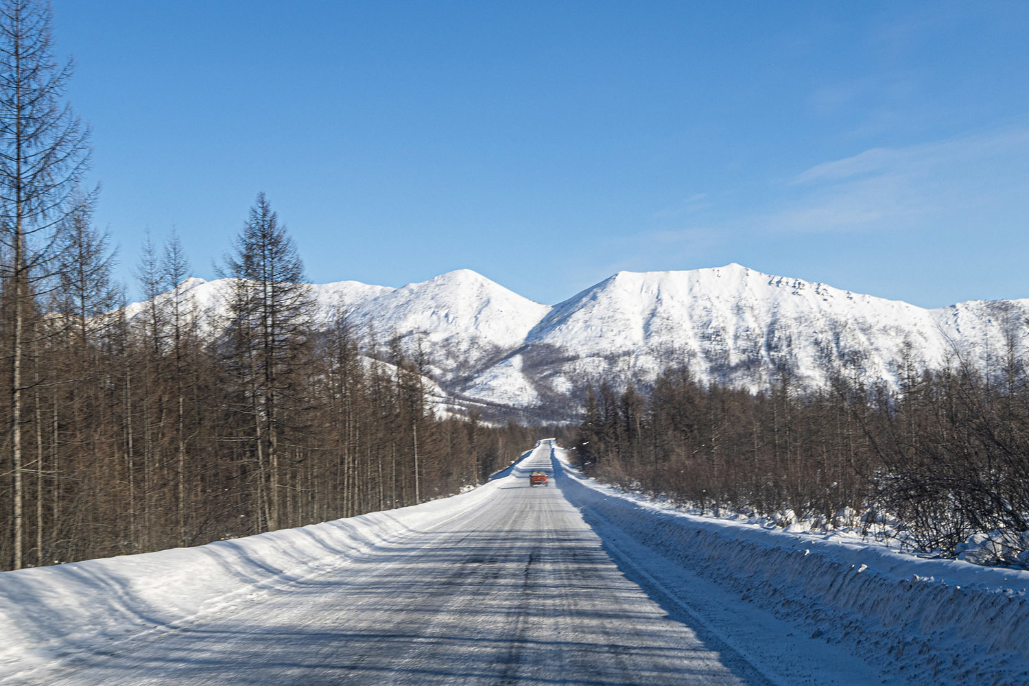 Решив исследовать этот уголок России, мы поехали по маршруту Магадан – Оймякон – Якутск. Я ожидал, что трасса «Колыма» окажется разбитой и труднопроходимой, но к своему удивлению обнаружил, что дорога, хотя и гравийная, была ухоженной, ровной и оборудованной отбойниками. Эти 1500 км пути превратились в удивительное путешествие по белому миру, где всё было покрыто инеем, словно белой шерстью. Когда температура опускается ниже -40 или даже -50, это просто гипнотизирует: ты едешь по бескрайним белым просторам, окружённым горами.