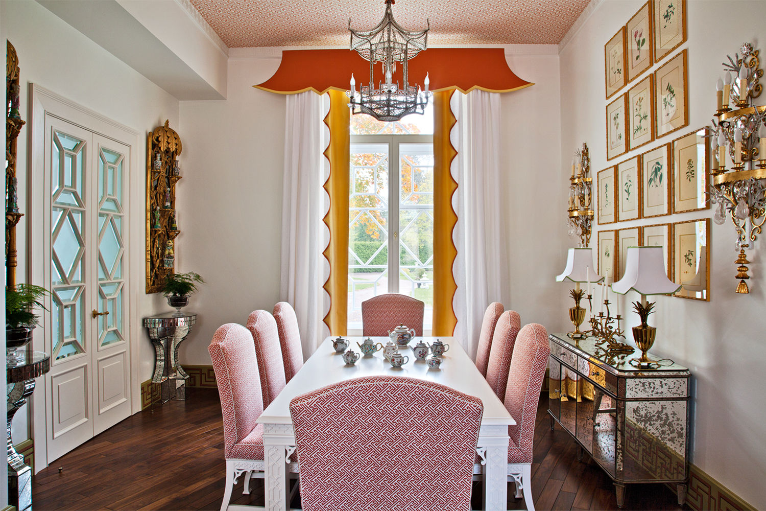 Другой мой проект с дворцовыми мотивами – оформление одного из павильонов в Китайской деревне на территории Царскосельского парка. Павильоны были построены при Екатерине II, на пике увлечения Китаем… Формы их очень декоративные – это Китай, которого не было, такая легкая игра-сказка в Китай. Никакого внутреннего убранства не сохранилось, и информации о нем не сохранилось, поэтому у нас было достаточно свободы в плане декорирования. Мы решили сделать абсолютно белые стены и сконцентрироваться на крупных элементах, которые были заимствованы с фасада, у формы крыш с полукруглыми фестонами. Даже кант для занавесок был взят из архитектуры. В гостиной сделали камин и поместили очень много старинного китайского фарфора, просто для красоты. Мне показалось, что игра в театр и подчеркнутая китайская тема будут адекватны месту.