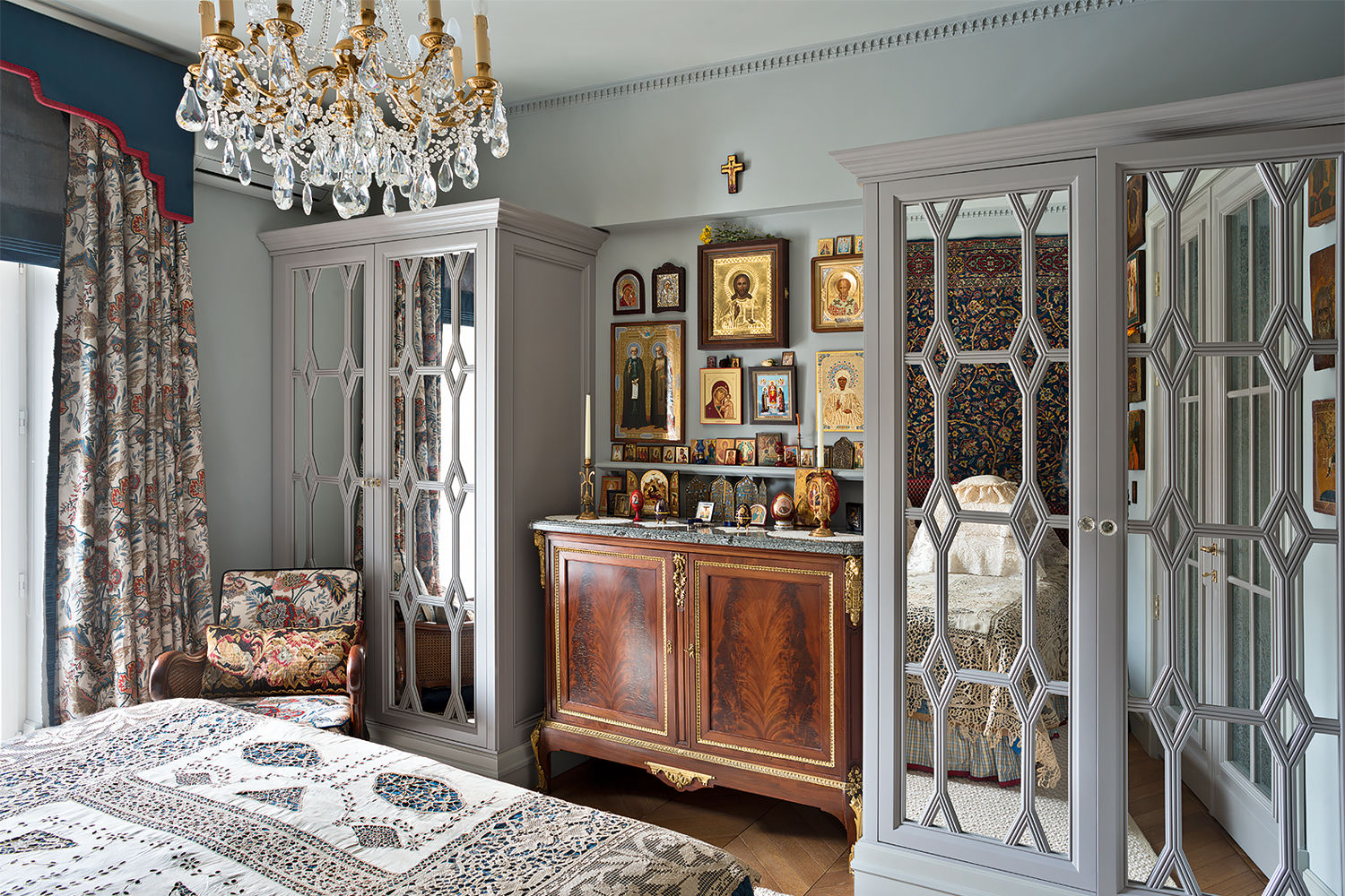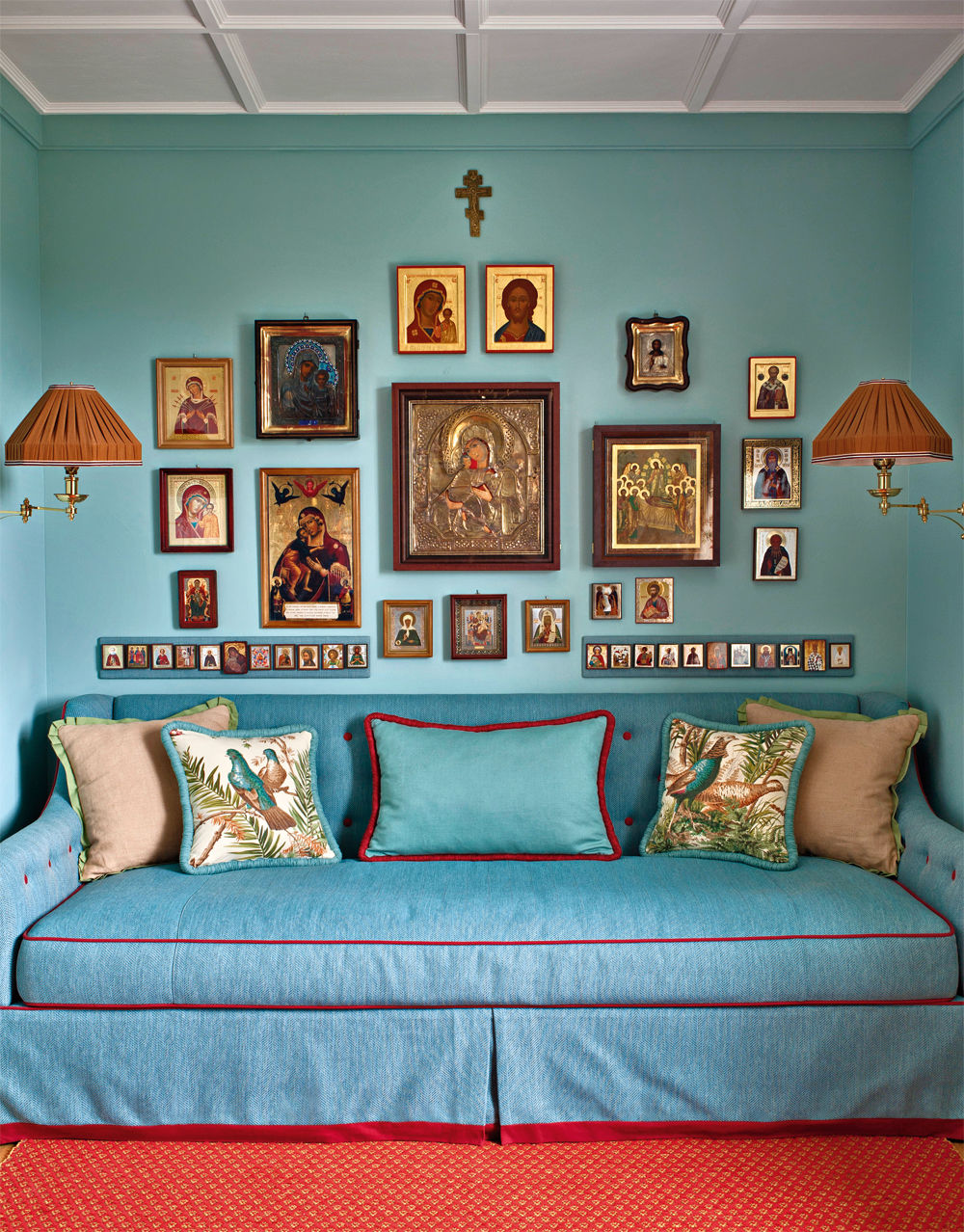 Вот, например, та же «тюлевая комната»: весь дизайн ее взялся из обоев. Мы использовали подлинные обои второй половины XIX века, изготовили такие же, ручной печати – получилась как будто серо-белая тюлевая задрапированная ткань с гирляндами розовых цветов. То есть весь вид этой комнаты родился из одного элемента. Или малый кабинет, приватный, в том же доме. В нем было очень много икон. Я, с одной стороны, хотел их расположить интимно, с другой стороны, сделать все красиво. В итоге мы сделали диван, который полностью занимает всю стену, в его цвет выкрасили стену. И иконы повесили так, как они должны быть в иконостасе. Мне очень нравится. На бирюзовом фоне все выглядит декоративно.