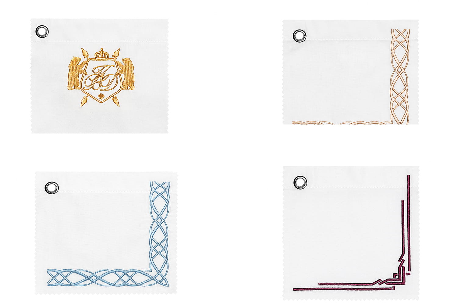 В ассортименте порядка тридцати цветов нитей и два типа орнамента: классический и геометричный, минималистичный (в любимом дизайнерами Togas стиле ар-деко). Монограмма же разрабатывается индивидуально под каждого клиента: есть возможность выбрать любой понравившийся шрифт и дополнить его декоративными элементами.
