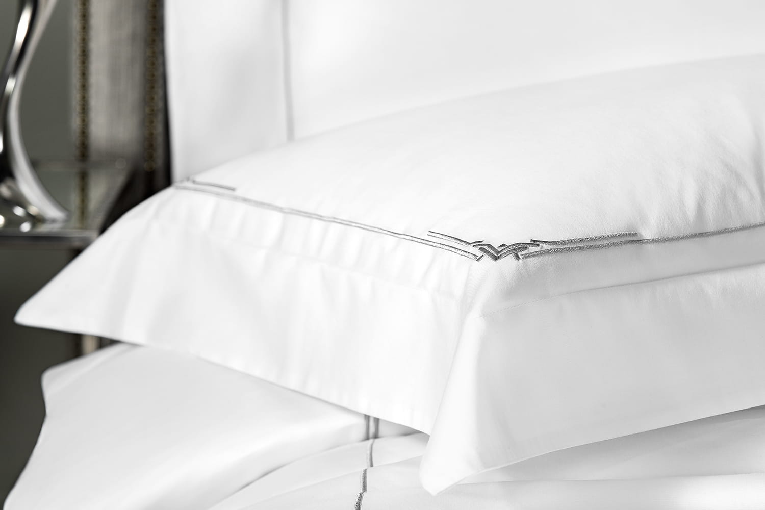 Для кастомайзинга доступно белое постельное белье из плотной ткани с маркировкой 300 ТС. (ТС расшифровывается как thread counts. 300 TC означает, что на квадратный дюйм ткани приходится 300 нитей. – Прим. ред.) Можно выбрать хлопковый комплект из коллекции Embroidery и оживить его изысканным бордюром по периметру наволочек и пододеяльника. (Вышивку сделают как и на готовом комплекте стандартного размера, так и на белье, сшитом по индивидуальной мерке.)
