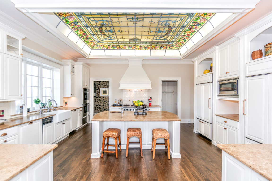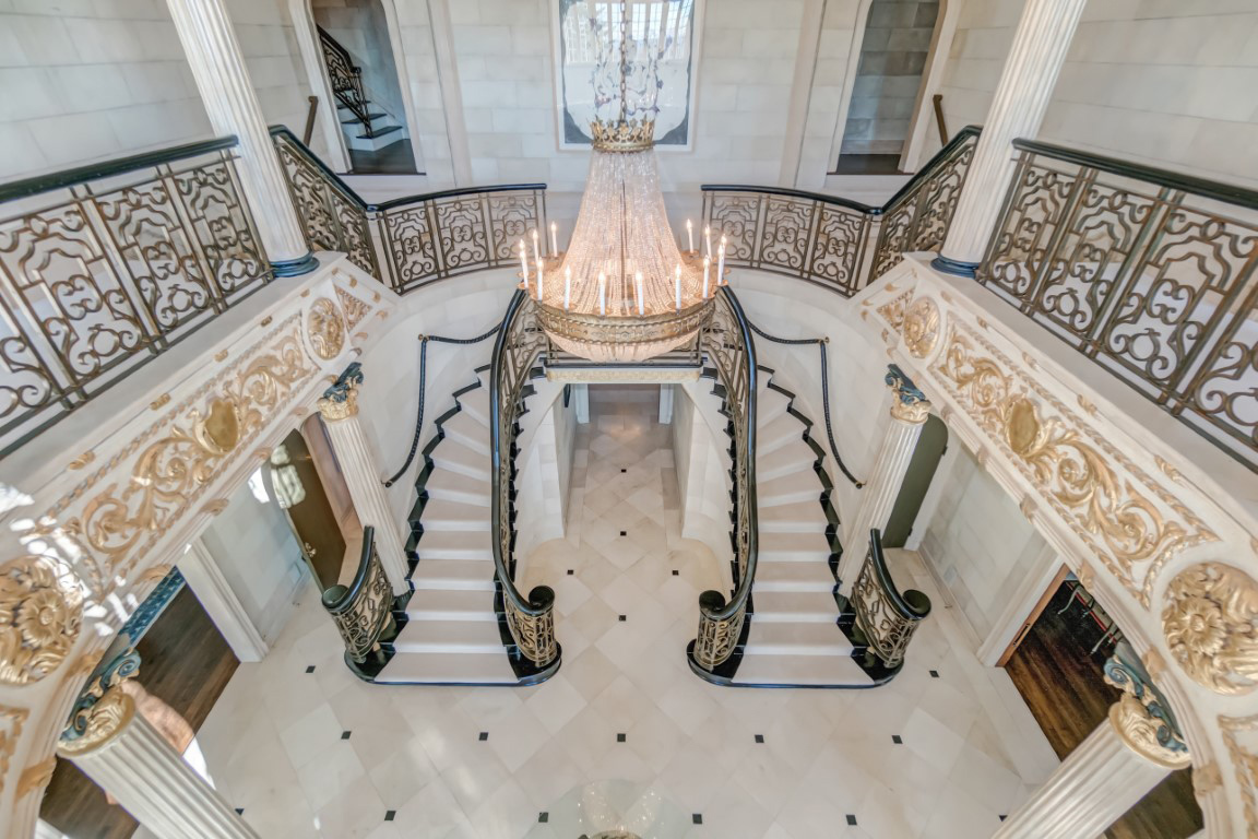 На территории есть также гараж на восемь автомобилей и несколько мест на гостевой парковке. Внутри находится грандиозное мраморное фойе с двойной лестницей, ведущей на следующий уровень. Есть несколько гостиных, одна из которых — с каменным камином; обеденный зал, большая кухня шеф-повара, впечатляющий витражный потолок, обеденная зона и арки, которые выходят на террасу.