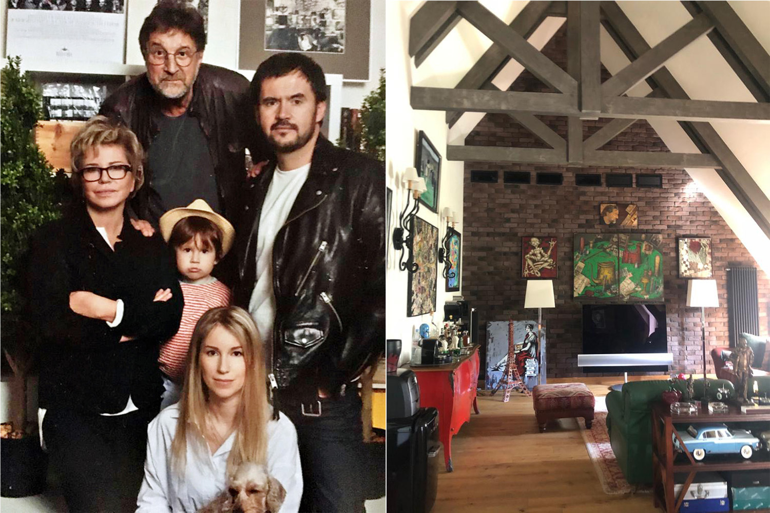 Темный потолок контрастирует со светлым полом. На первом этаже есть маленький летний кабинет, где Леонид Ярмольник любит почитать в уединении. На втором этаже две спальни, кабинет и бильярдная, двери которой выходят в галерею, соединяющую две половины здания. По стенам – живопись Василия Шухаева, Кузьмы Петрова-Водкина, Натальи Нестеровой, эскиз Павла Соколова-Скаля, писавшего портрет мамы Оксаны.