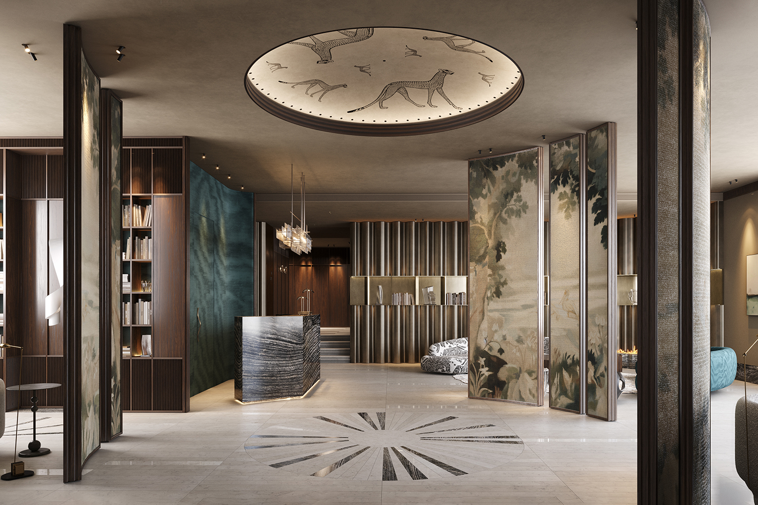 Лобби украшено камином, гобеленами, эксклюзивными предметами мебели и декора, а также ручной росписью на стенах и потолке. В основе дизайна лежат природные мотивы, через текстуры и узоры напоминающие о великолепии природы.