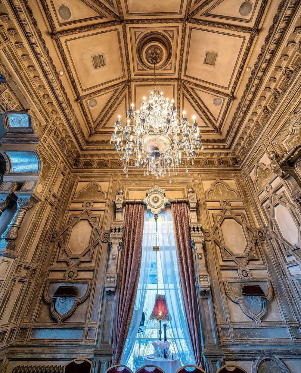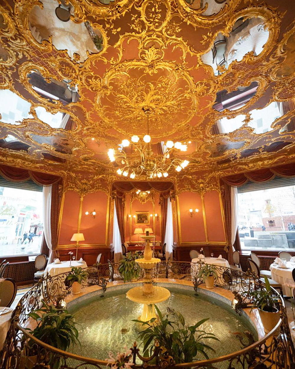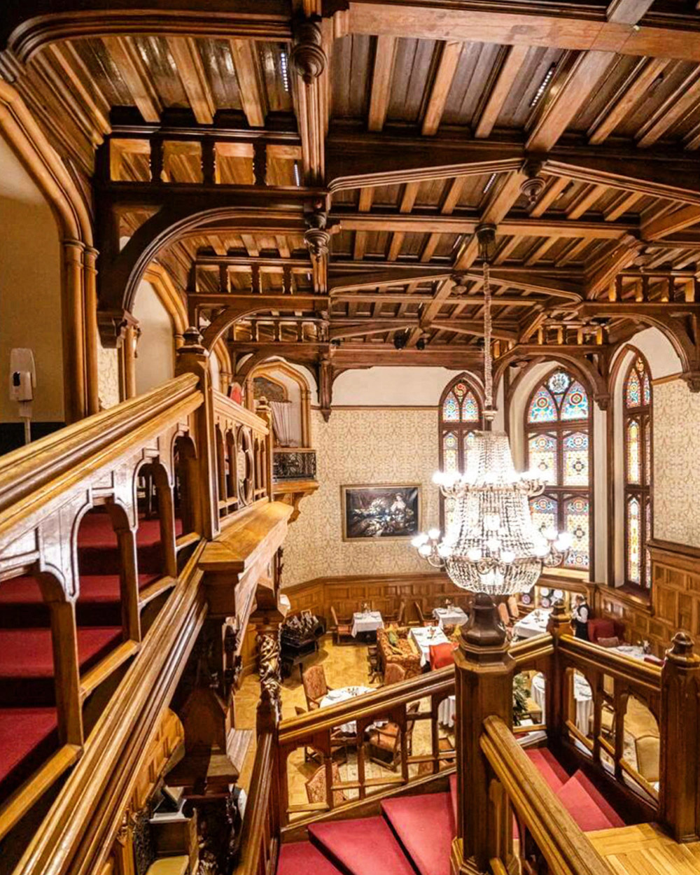 Ресторан располагается в особняке Святополк-Четвертинского, который построен в 1889 году по проекту архитектора П.С. Бойцова. Особняк на Поварской напоминает английский замок и построен он в стиле эклектика с элементами неоренессанса, необарокко и неоготики. Внутри почти все помещения изысканно отделаны деревом. Деревянная отделка и мебель в особняке были заказаны на мебельной фабрике Павла Шмита. На лестнице на резных деревянных колоннах сохранились резные лики – бородатого мужчины и девушки. Считается, что это изображения древесных божеств, дриад. Особняк чудом не был разграблен, а с 1932 года передан Союзу писателей.