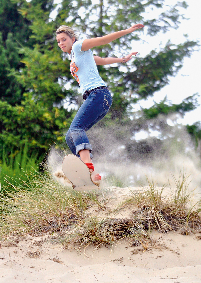 Г орячий сухой песок, как ни странно, отличная замена снегу. Технически катание по дюнам мало отличается от катания по зимним склонам, только скорости несравнимы. Освоить его лыжнику со стажем достаточно просто: нужно только научиться плавно тормозить, не перелетая при этом через голову, и класть лыжи на бок с большим усилием – канты на песке не помощники. И привыкнуть к жесткости склона – кочка, которая зимой только придает ускорения, летом больно бьет по ногам. С доской все еще проще – она быстрее разгоняется и легче в управлении, так что опытные сендбордеры даже крутят на барханах фрондсайды и бэкфлипы. Устоять на ногах после прыжка непросто, при приземлении вы не катитесь вперед по инерции, а зарываетесь в тормозящий песок. Не стоит кататься без хорошей защиты для локтей и колен, а также маски, которая убережет глаза от царапучих песчинок.