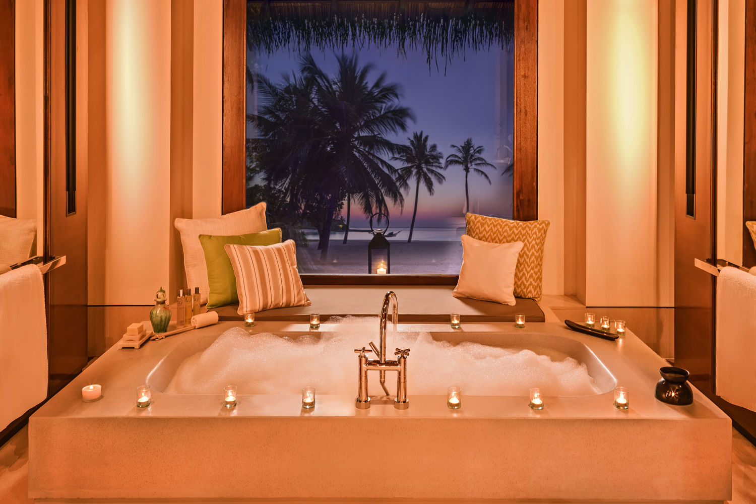 12 бассейнов, включая инфинити-бассейн, создающий иллюзию бесконечной водной глади, шесть ресторанов, свадебная беседка, художественная школа, дайвинг-клуб, спа-центр, 36 частных вилл с видами на океан, террасами и собственным пляжем. И на сотни метров никого. Эту территорию комфорта на самом крупном в архипелаге насыпном острове (на площади 44 га) спроектировал французский архитектор Жан-Мишель Гати. Все виллы выдержаны в колониальном стиле со множеством этнических элементов дизайна и вкраплением ярких цветов в отделке. На выбор предлагаются отдельно стоящие на берегу виллы с собственным пляжем, виллы с бассейном, Duplex Beach Villa, состоящая из двух отдельно стоящих сооружений, водные виллы, построенные на сваях и соединенные с берегом деревянными мостками, и, наконец, роскошная резиденция Grand Sunset площадью 2487 кв. м с тремя спальнями, гостиной, столовой, 50-метровым бассейном и 30-метровой террасой. Райский отдых обойдется от $1900 до $25 000 в день, в зависимости от сезона и размера виллы.