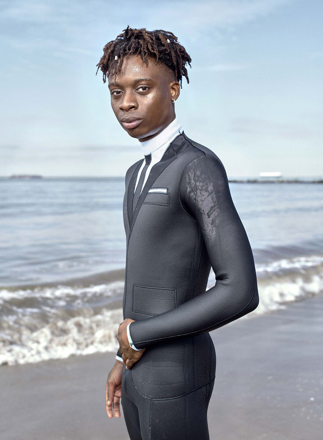 Нью-йоркский модельер Том Браун известен тем, что изменил силуэт мужского костюма, наподобие Джорджио Армани, деконструировавшего крой в 1970-х, и Рафа Симонса, который до сих пор не выходит из списка фаворитов на мировых неделях моды. Силуэт Брауна ‒ укороченные высоко посаженные брюки. При этом силуэт его дизайнерского костюма для серфинга не следует этому почерку и является вполне традиционным, вся суть ‒ в креативном принте со смысловой нагрузкой.