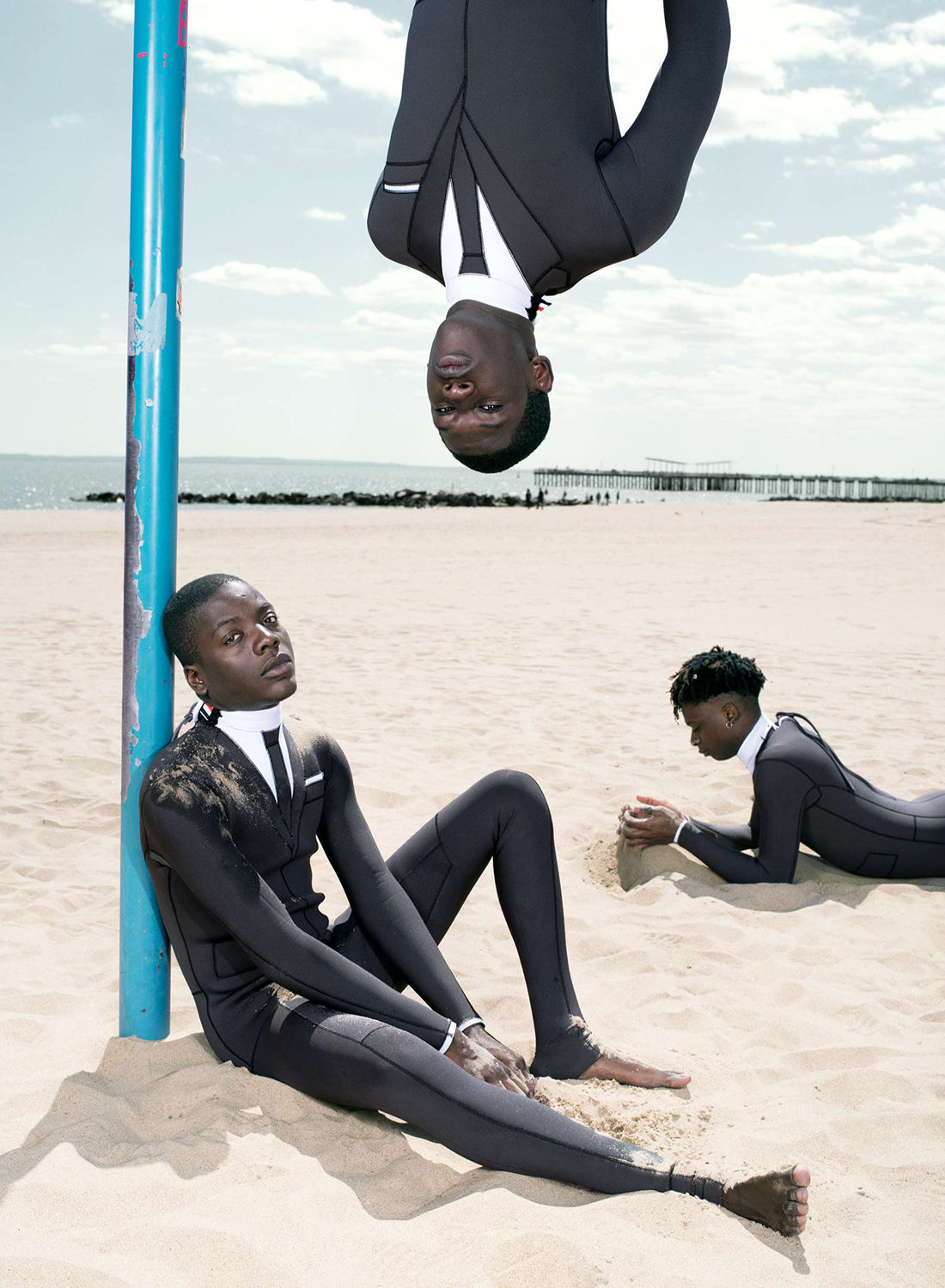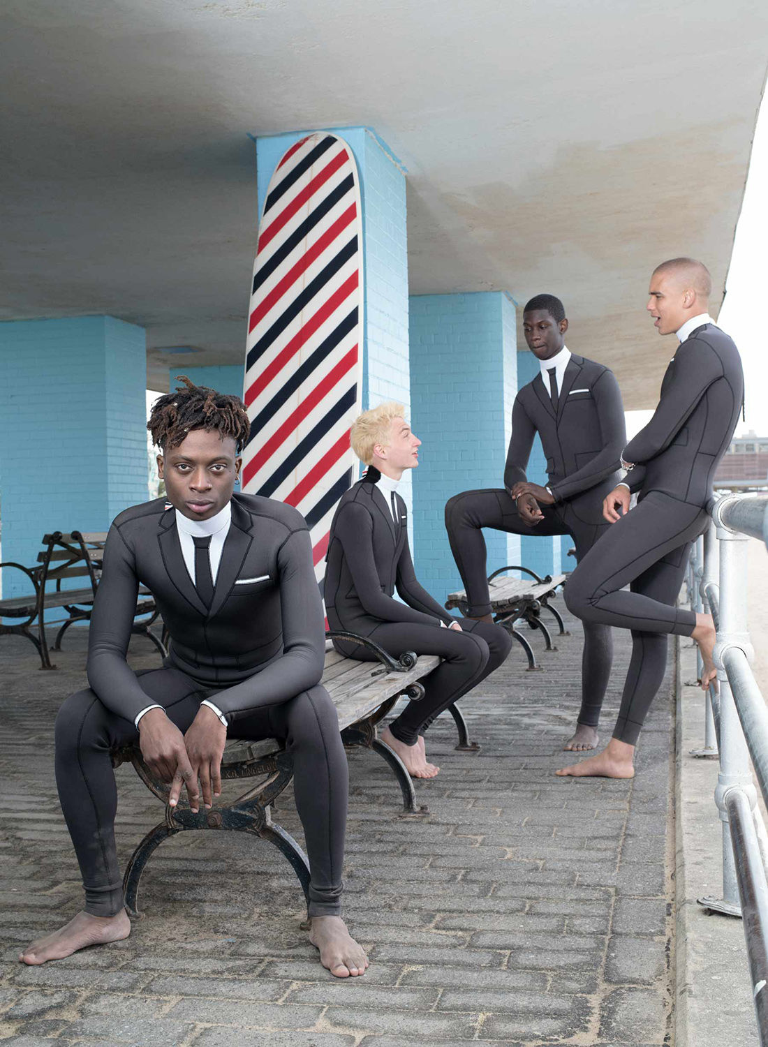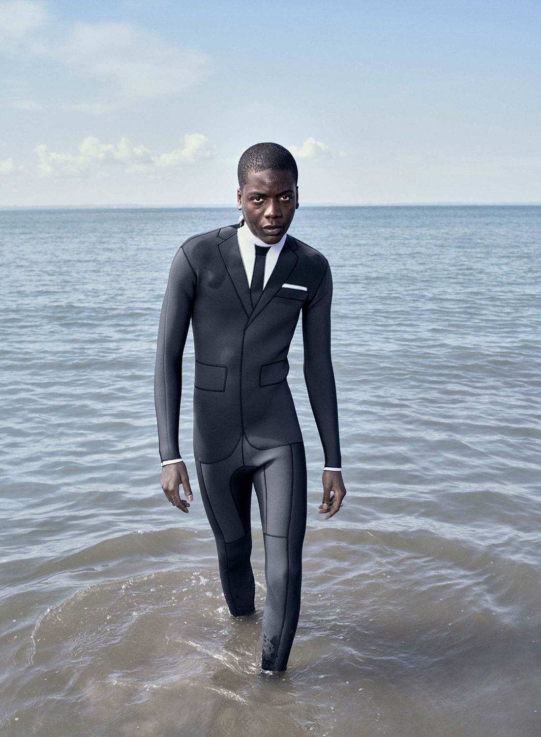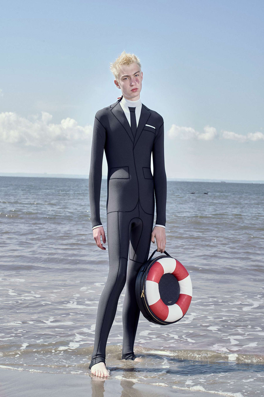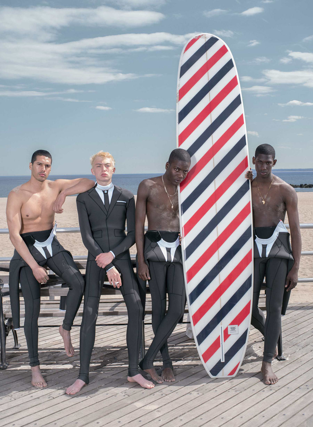 К остюм должен сидеть идеально, верно? А как насчет полностью облегающего костюма? Насколько это приближает нас к идеалу? Помимо того что это явный эксперимент на тему «Что бы такого интересного придумать для серферов, чтобы это не был принт в виде американского флага и не выглядело как инструкция по разделке туши», коллекция Thom Browne. Surf – это еще и философский эксперимент, попытка соединить несоединимое.
