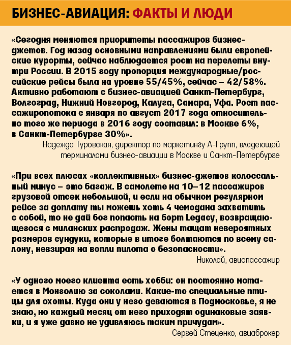 «Тренд деловой авиации 2017 года – оптимизация расходов, – рассказывает Дмитрий Петроченко, руководитель проекта BizavNews. – Клиенты все чаще смотрят в сторону снижения затрат на перелеты, выбирая более бюджетные решения; зачастую отказываются от владения собственными воздушными судами в пользу чартерных операторов. Экономия по некоторым позициям может доходить до 60%. Небольшие компании стараются оптимизировать расходы на перелеты топ-менеджеров среднего и высшего звена, пересаживая их на бизнес-чартеры или операторов авиатакси. Европа переживает настоящий бум бюджетных проектов в области деловой авиации».