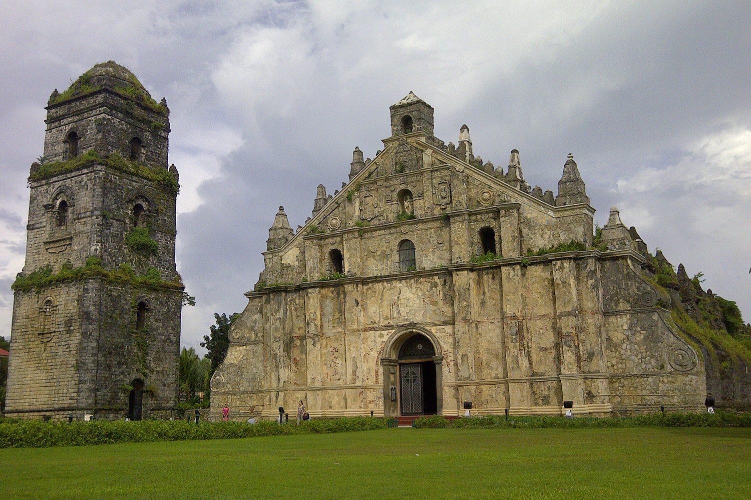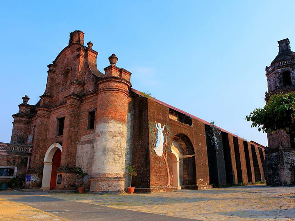 В отличие от традиционного испанского городского плана, согласно которому храмы располагаются на центральной площади города, церковь находится на вершине отдельно стоящего холма, окруженного каменной стеной. Приземистая и массивная колокольня, увенчанная маленьким куполом, напоминает китайскую пагоду. Для того, чтобы попасть в церковь, нужно преодолеть 85 каменных ступеней, которые ведут во внутренний двор. На противоположной стороне двора находится еще одна внушительная лестница, которая спускается к дамбе, возвышающейся над рисовыми террасами. Построенная из кирпича, церковь имеет монументальный фасад. Толстые боковые стены не украшены никаким орнаментом, но имеют красивые резные боковые входы, которые регулярно подкрепляются огромными четырехугольными контрфорсами – они необходимы для защиты от землетрясений.