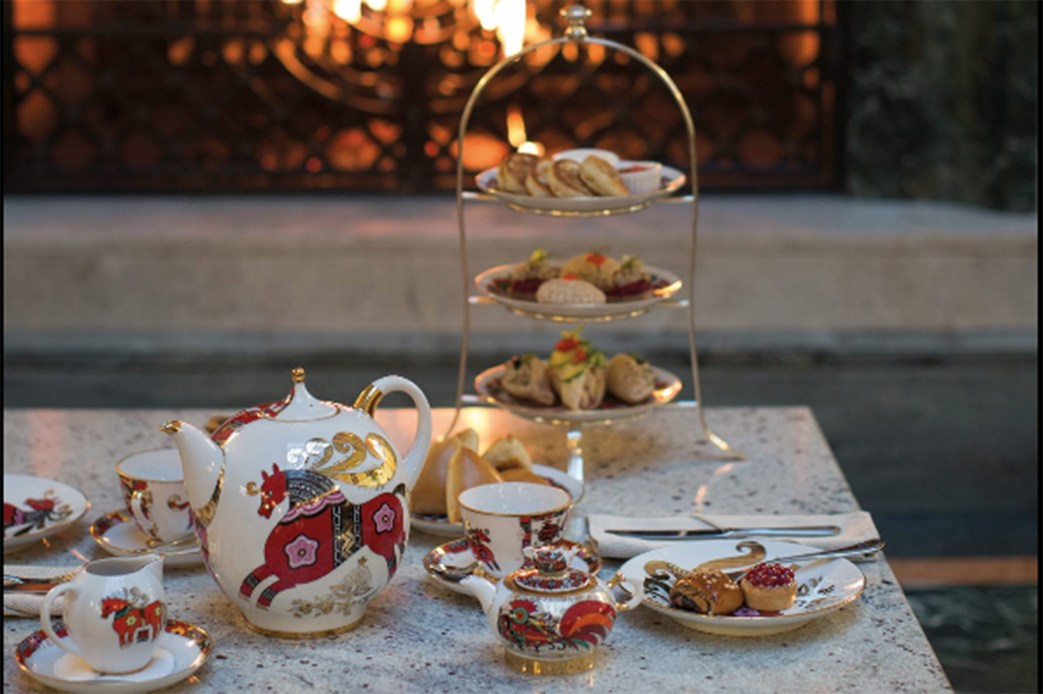 Русское чаепитие в кафе «Мезонин» под нежные переливы арфы – это не только гастрономические впечатления, но и настоящее празднество вкуса и цвета. Радует глаз уже сама подача. На столе красуются пузатые чайники в русском стиле от Императорского фарфорового завода с красочным орнаментом: на чашках золотом горят гребешки красных петухов. С бокалом розового игристого вина на изящной серебряной этажерке подается ассорти мини-сэндвичей: профитроли с форелью, рулетик с осетриной горячего копчения, бутерброд с паштетом из куриного филе и грецкого ореха, валован с сельдью. Отдельно сервируются пышные блинчики с красной икрой, миниатюрные пирожки с мясом и капустой. Финальный аккорд – ассорти мини-десертов: «Графские развалины», медовик и эклер.