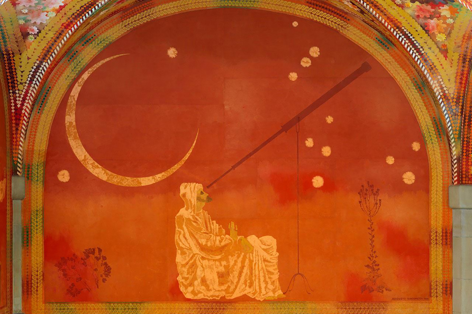 Джакометти привлек художников Якоба Гублера, Джузеппе Скартеццини и Франца Риклина для работы над этой фреской, превратив спустя несколько лет помещение в «зал маленьких цветов» – именно так ласково горожане называют вестибюль Джакометти из-за большого числа узоров с цветами.