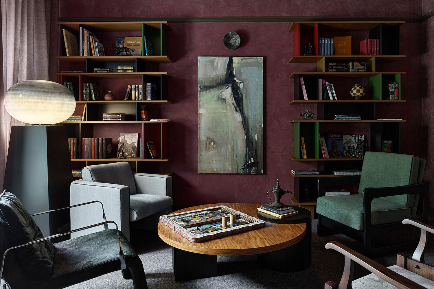 С одной стороны, такая гамма отсылает к традиционной колористике ивановских ситцев, а с другой – к палитре алхимических опытов. Выбранное цветовое решение идеально для создания уютной обволакивающей атмосферы и для экспонирования предметов искусства. А они здесь повсюду: в лобби, библиотеке и в каждом номере.
