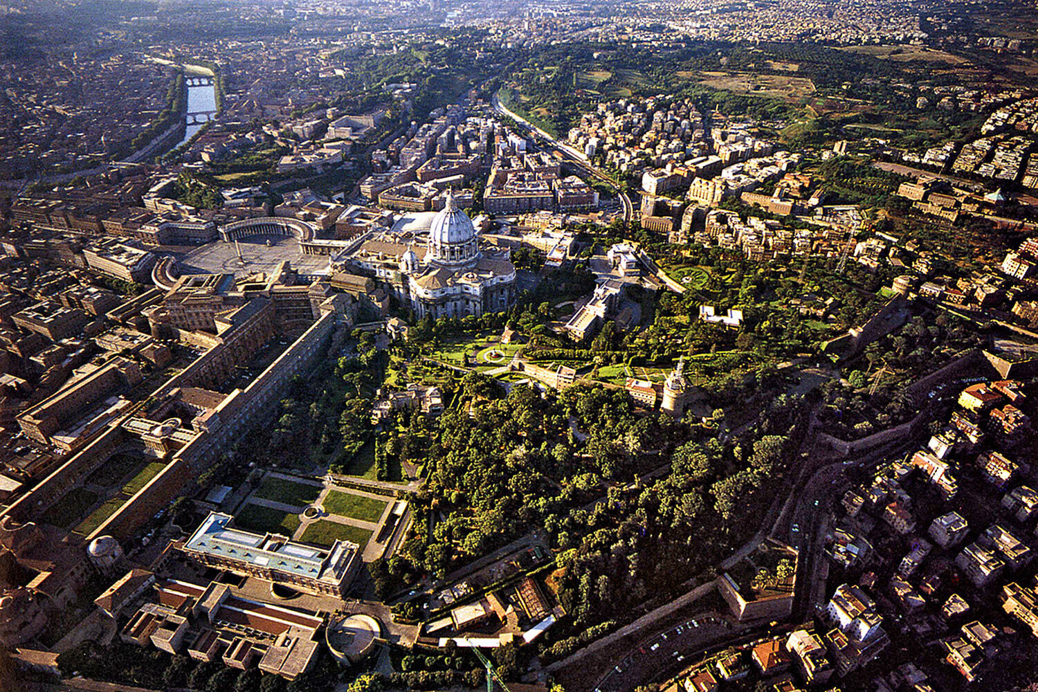 Границей Ватикана служит оборонительная стена, символично переходящая в величественную колоннаду вокруг площади Святого Петра. По замыслу автора, Джованни Лоренцо Бернини, колоннада должна символизировать широко раскрытые объятия церкви.