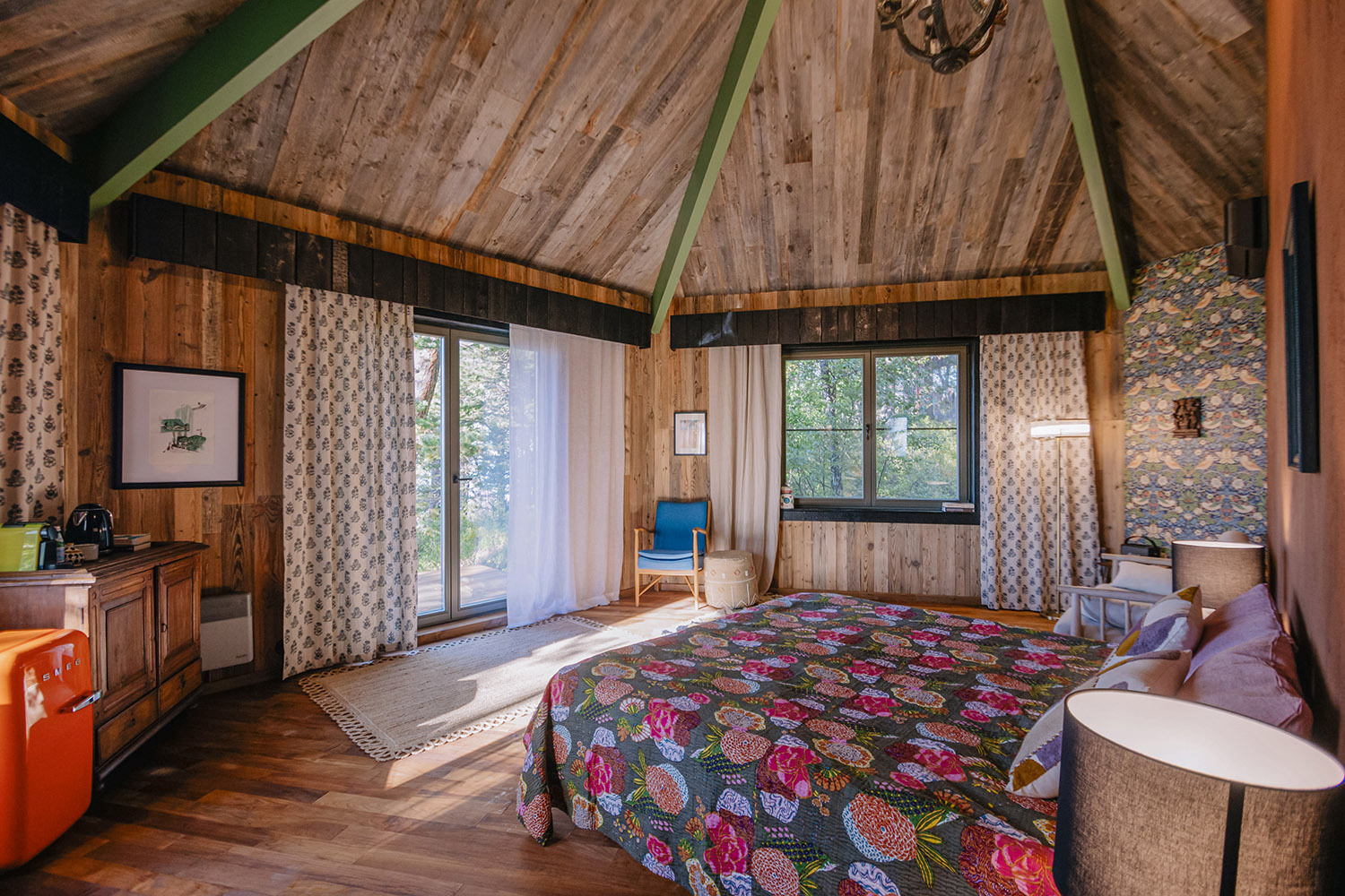 Погрузиться в ретрит в Postnicken могут до двенадцати человек (дом можно снять только полностью). А для компаний поменьше Бармин построил домики «А-фреймы» на берегу речки – для перезагрузки тела и разума под дружный хор лягушек. Громче них в Postnicken никто не звучит. Это один из принципов ретротерапии Олега Бармина. К нему едут не за вечеринками до рассвета. Зато красиво встречать восход солнца вместе с местными аистами (какие же это невероятные птицы!) не возбраняется.