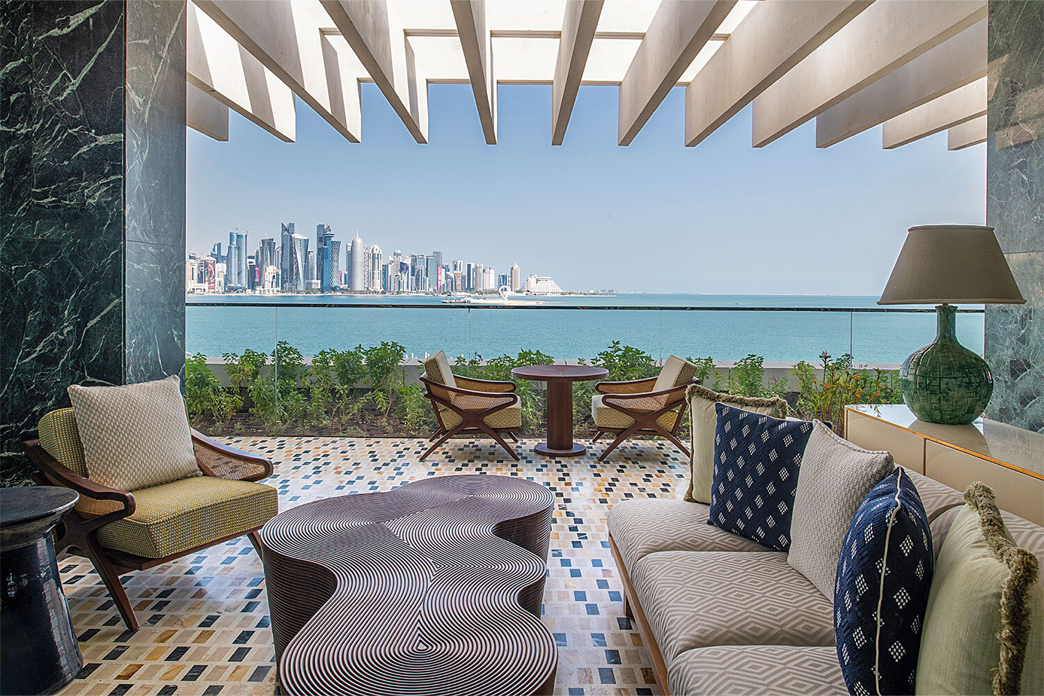 Во время своего последнего путешествия в Катар я жил в The Ned Doha и остался под впечатлением. Отель занимает бывшее здание Министерства внутренних дел, так что само пространство — архитектура 60‑х, бетонные потолки — задает особую брутальную атмосферу, при этом здесь сделан стильный ремонт с деталями из мрамора, цветной плиткой и мягкими тканями, с историческими отсылками в виде винтажных радиоприемников и телефонов. Номера очень просторные, с балконами и ваннами на ножках, а вид на набережную и залив с террасы — отдельное удовольствие. К тому же по всему отелю можно увидеть коллекцию оригинальных произведений искусства, созданных местными художниками, большинство из которых женщины, — и это не просто украшение интерьера, а часть идентичности пространства.