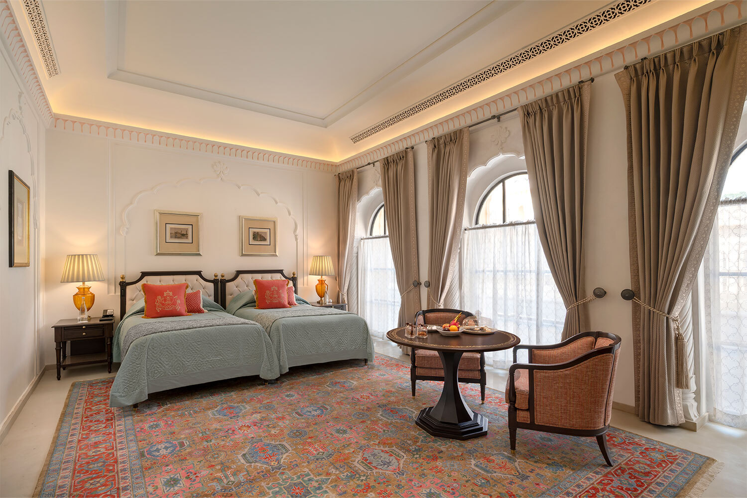 В The Oberoi Rajgarh Palace, территория которого занимает более 30 га, всего 65 номеров и люксов, включая виллы с частными бассейнами и садом. Гастрономическая составляющая отеля представлена несколькими ресторанами и барами: от изысканных ужинов во дворце в ресторане Maanya до неторопливых трапез у воды в Neerangan. Спа-центр Asmi у озера, куда гостей привозят на лодке, дополняет впечатление от места.