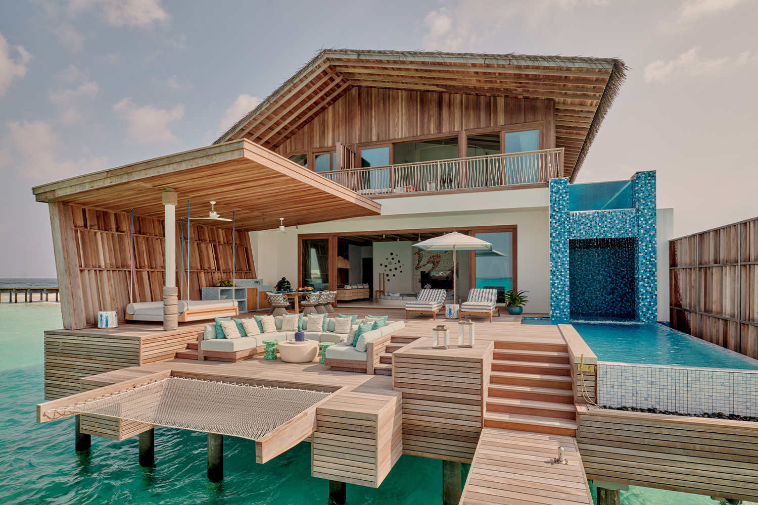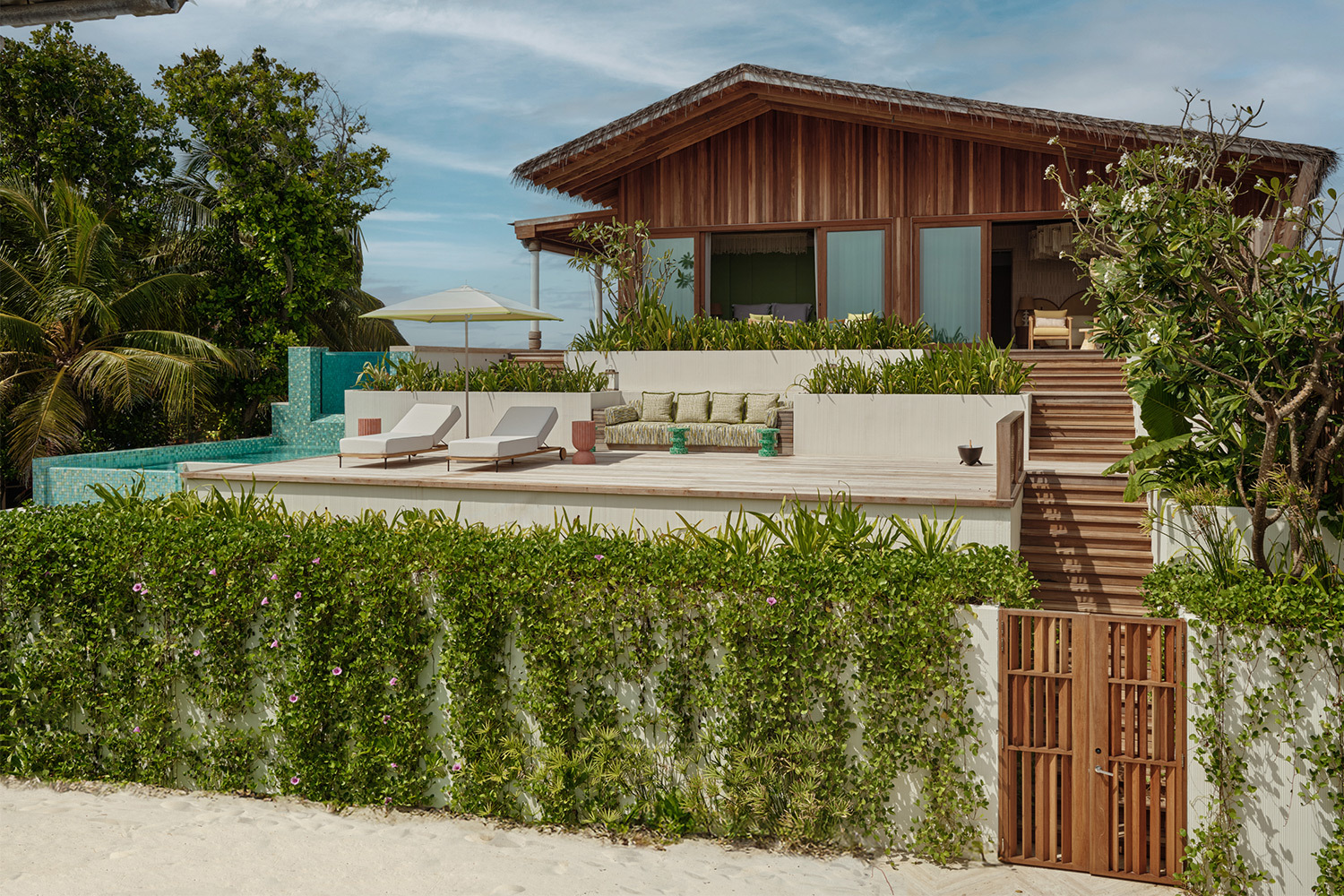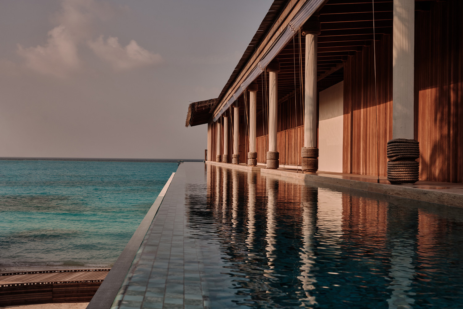 Курорт входит в портфолио Seaside Collection и позиционируется как «самый маленький роскошный курорт Мальдив», подчеркивается не количество опций, а их плотность и персонализация. За архитектуру .Here отвечает бюро Kulör Group, за интерьеры — лондонская студия Muza Lab, отвечавшая за соседний Finolhu в том же атолле. Их задача была не построить «еще один мальдивский отель», а сделать так, чтобы здания буквально растворялись в природе. Много дерева и камня, нежная пастельная цветовая гамма, окна в пол, минимум визуального шума. Резиденции здесь больше напоминают частные дома: на Somewhere — пять трехспальных вилл площадью порядка 1100–1200 м² и две четырехспальные около 1400 м², каждая с прямым выходом к океану, а на Nowhere — просторные резиденции, одна — площадью 1000 кв м, с тремя спальными, вторая — 2400 м², с пятью спальнями, собственным пляжем и длинным бассейном.