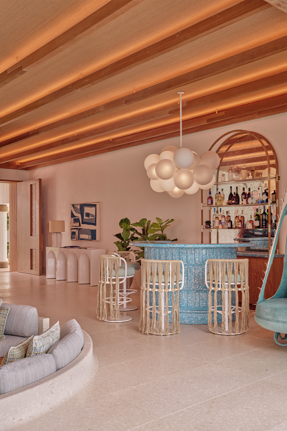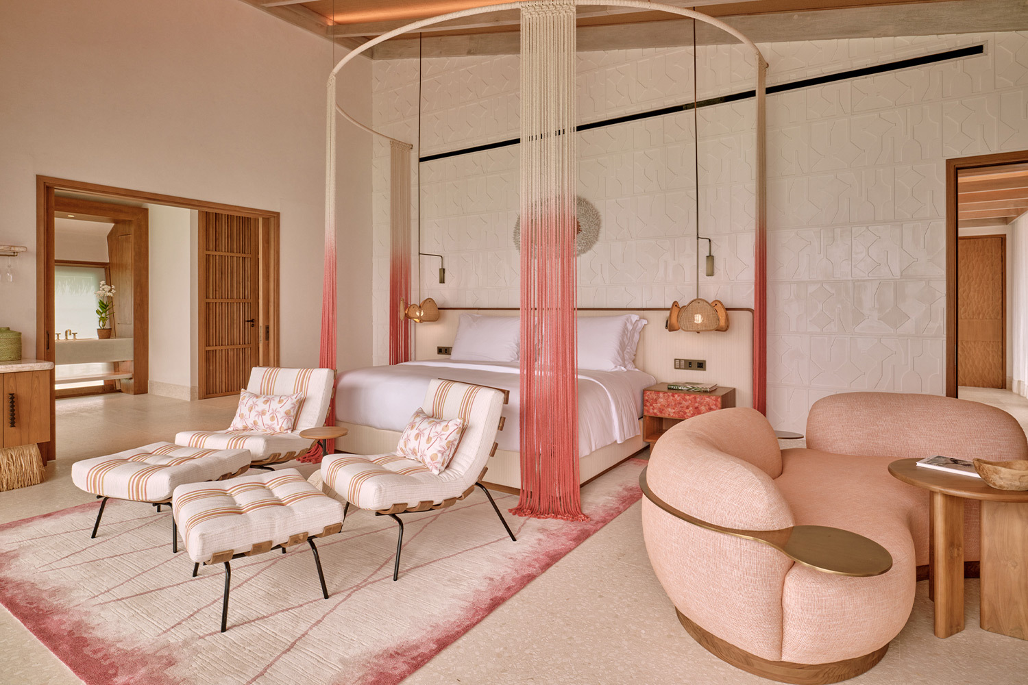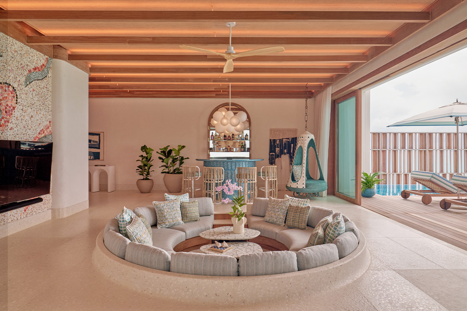 Курорт входит в портфолио Seaside Collection и позиционируется как «самый маленький роскошный курорт Мальдив», подчеркивается не количество опций, а их плотность и персонализация. За архитектуру .Here отвечает бюро Kulör Group, за интерьеры — лондонская студия Muza Lab, отвечавшая за соседний Finolhu в том же атолле. Их задача была не построить «еще один мальдивский отель», а сделать так, чтобы здания буквально растворялись в природе. Много дерева и камня, нежная пастельная цветовая гамма, окна в пол, минимум визуального шума. Резиденции здесь больше напоминают частные дома: на Somewhere — пять трехспальных вилл площадью порядка 1100–1200 м² и две четырехспальные около 1400 м², каждая с прямым выходом к океану, а на Nowhere — просторные резиденции, одна — площадью 1000 кв м, с тремя спальными, вторая — 2400 м², с пятью спальнями, собственным пляжем и длинным бассейном.
