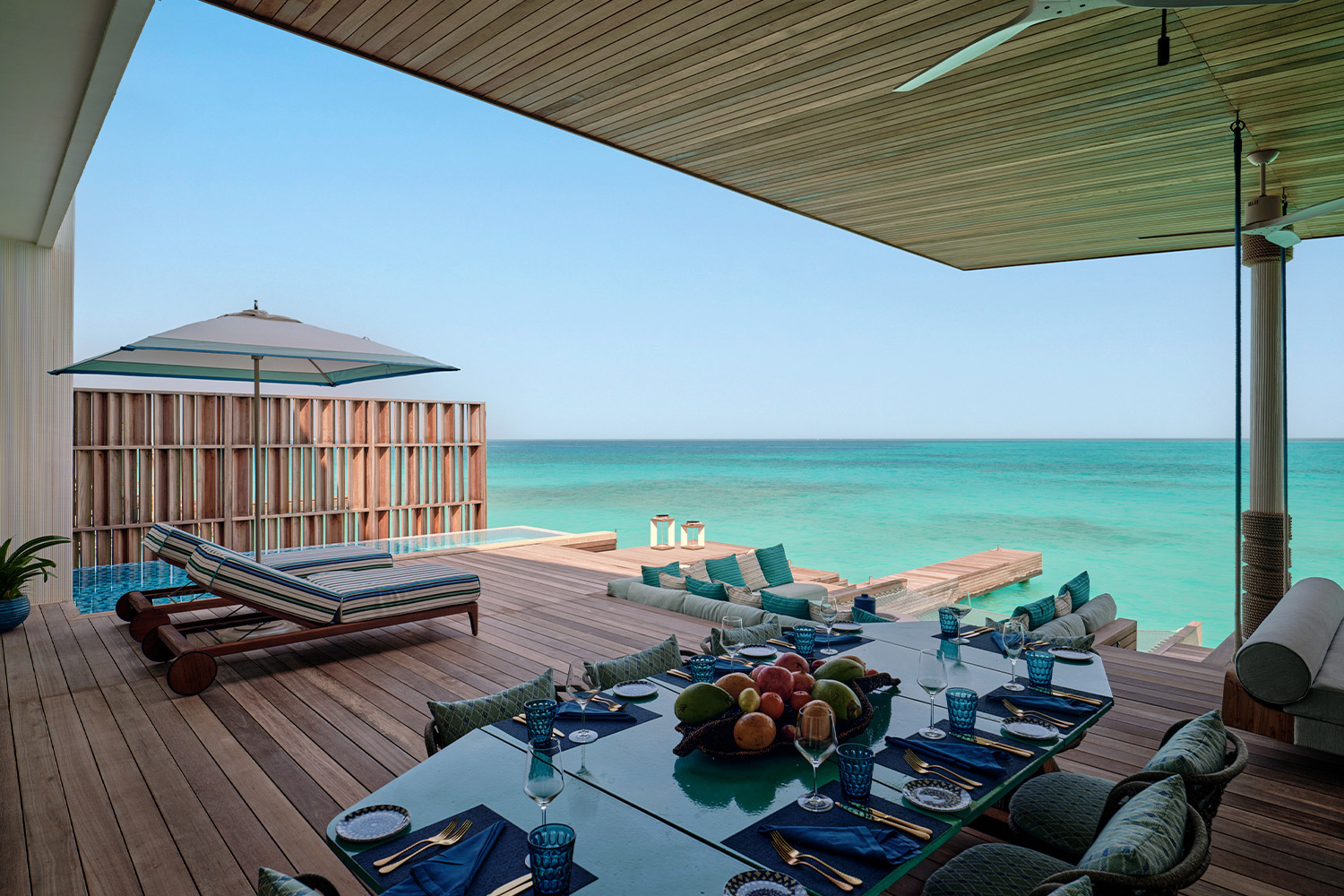 За каждой виллой закреплен персональный Roohu — не просто батлер, а куратор проживания, который, исходя из привычек гостя, его гастрономических предпочтений и привычного распорядка дня, организует сценарий пребывания. От утренней тренировки или медитации на террасе до спонтанного ужина на песчаной косе — все организуется так, что гость почти не замечает логистики, а просто «перетекает» из одного настроения в другое. Вместо привычного all‑day‑ресторана акцент сделан на in‑residence dining: круглосуточный сервис в резиденциях, возможность воспользоваться услугами персонального шефа и блюда, которые адаптируют под вкусы каждого гостя. Но если захочется «выйти в люди», то в ресторане Safar можно попробовать авторскую кухню с мягкими отсылками к мальдивской культуре.