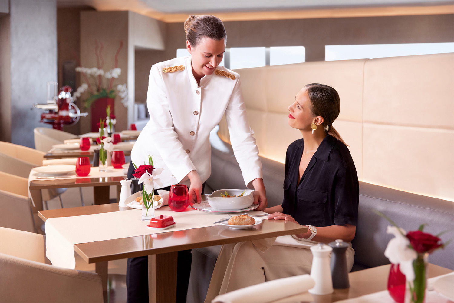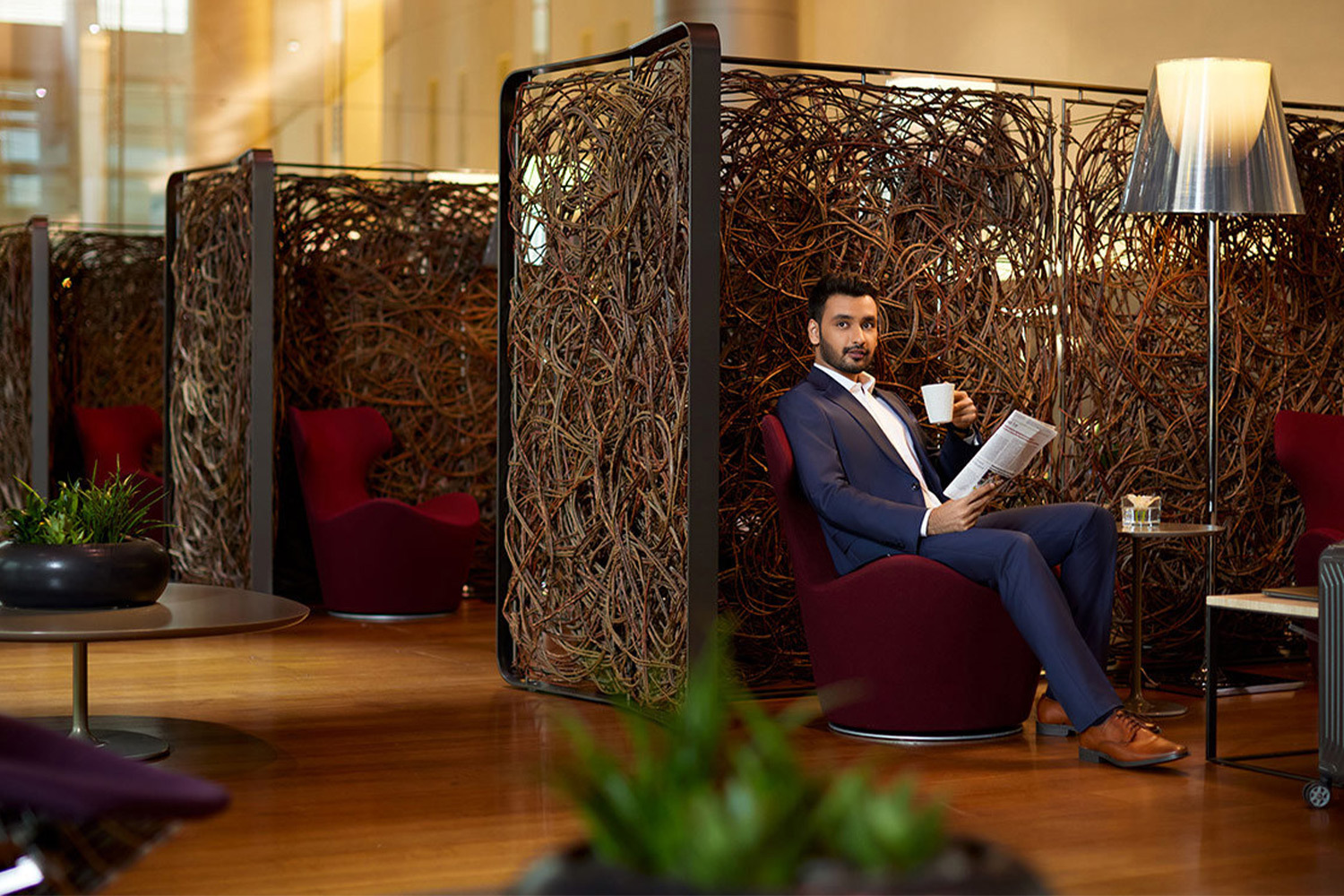 Путь пассажира первого класса Singapore Airlines начинается задолго до посадки на борт: выделенная стойка регистрации и приватный коридор к иммиграционному контролю сразу отделяют его от общего потока. Private Room — зал внутри зала, самое закрытое пространство лаунжа SilverKris. Здесь все подчинено идее уединения: кожаные кресла расставлены так, чтобы взгляды не пересекались, комнаты для отдыха — строго индивидуальные, а в обеденном зале блюда подают с серебряных подносов в лучших традициях классического ресторанного сервиса.