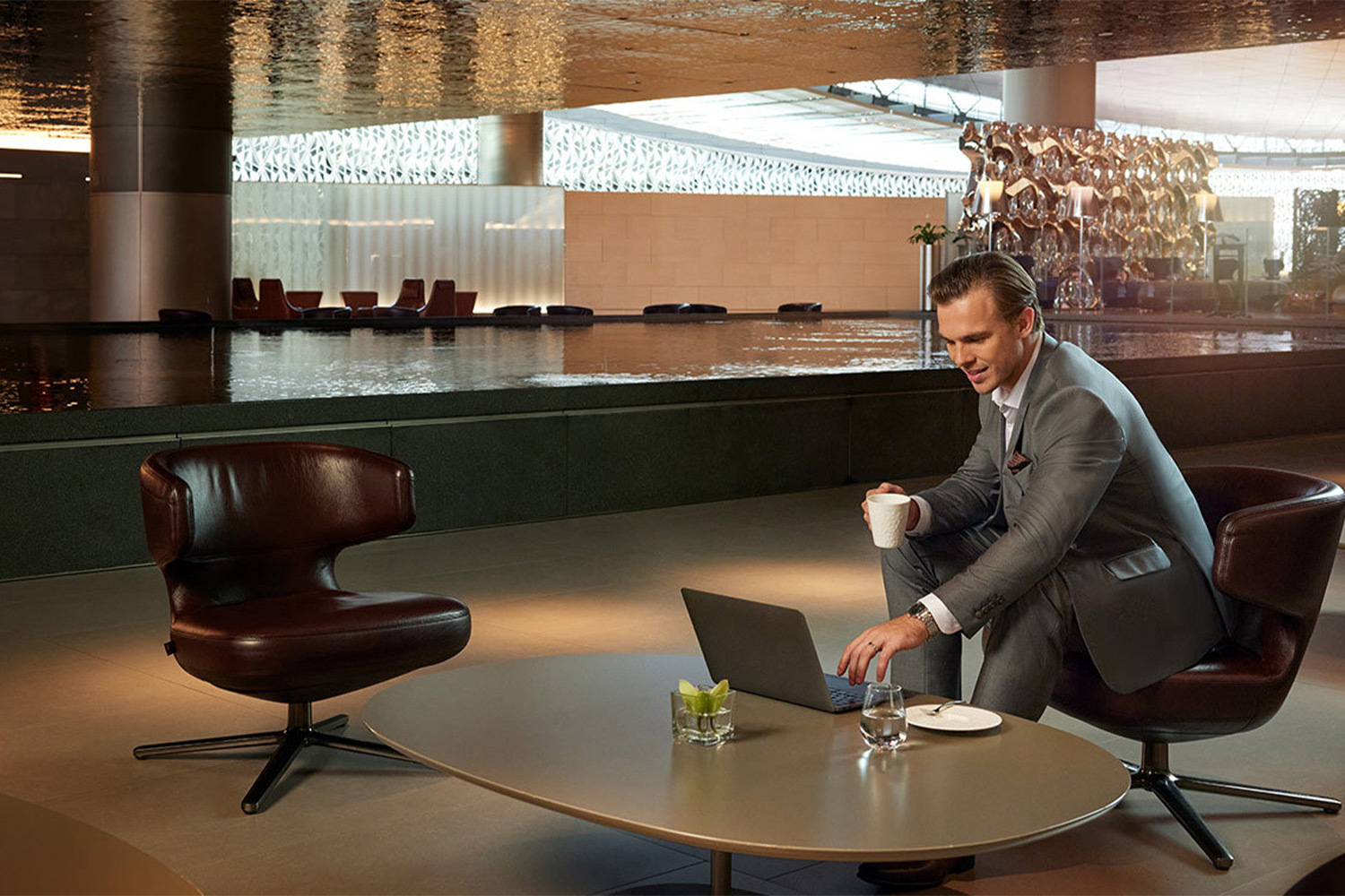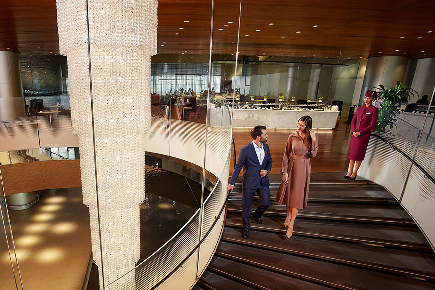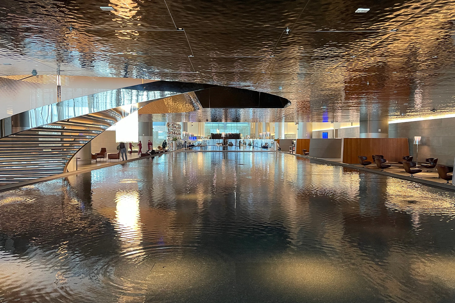 Масштабы этого лаунжа впечатляют: 10 000 квадратных метров, где архитектурные решения — широкая спиральная лестница и искусственный бассейн-озеро, отражающийся в зеркальном потолке — создают ощущение грандиозности. Здесь найдется все: от капсул для сна и игровых зон до бизнес-центра и ресторанов, предлагающих как арабскую классику, так и изысканные десерты.